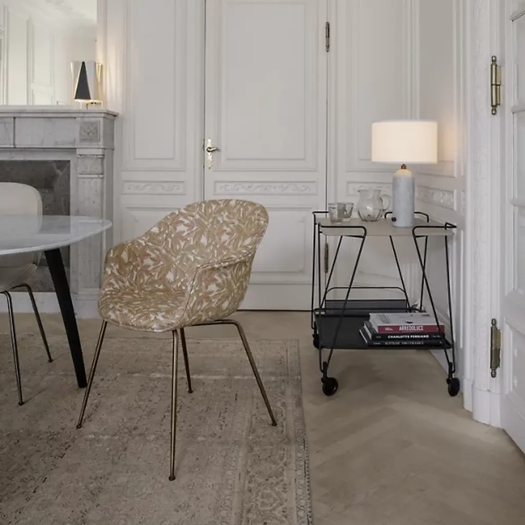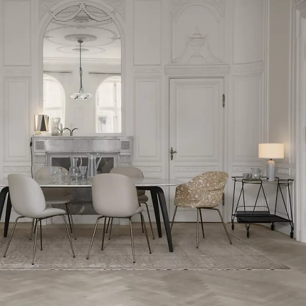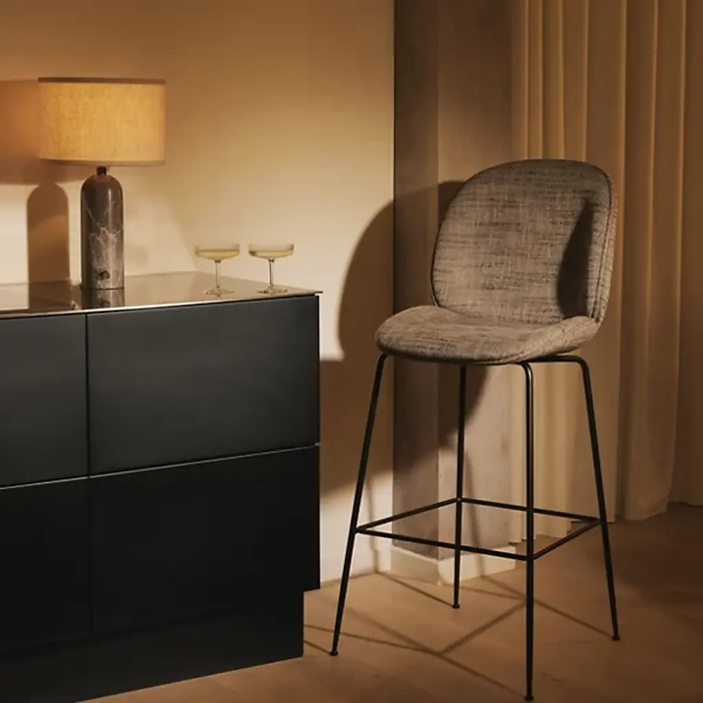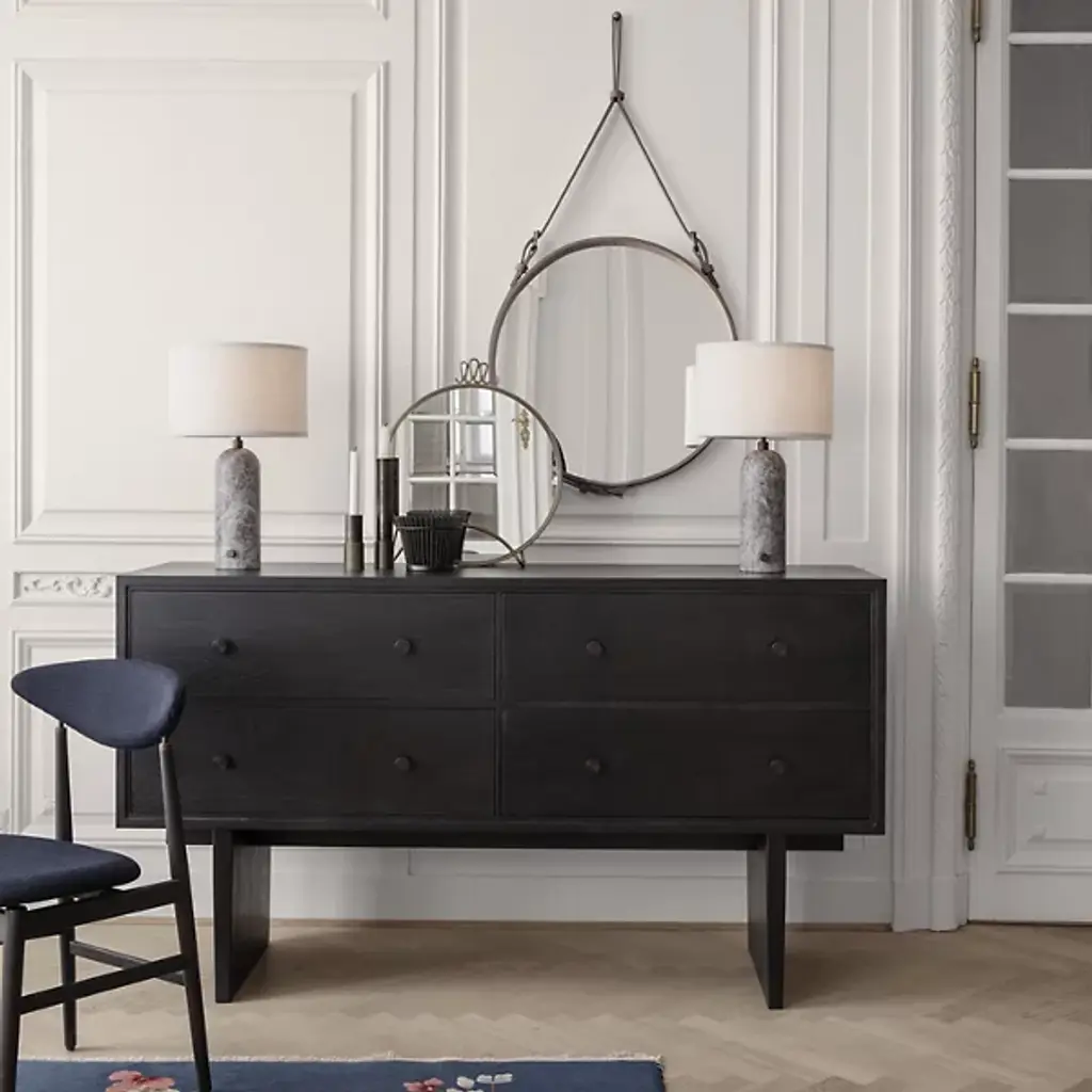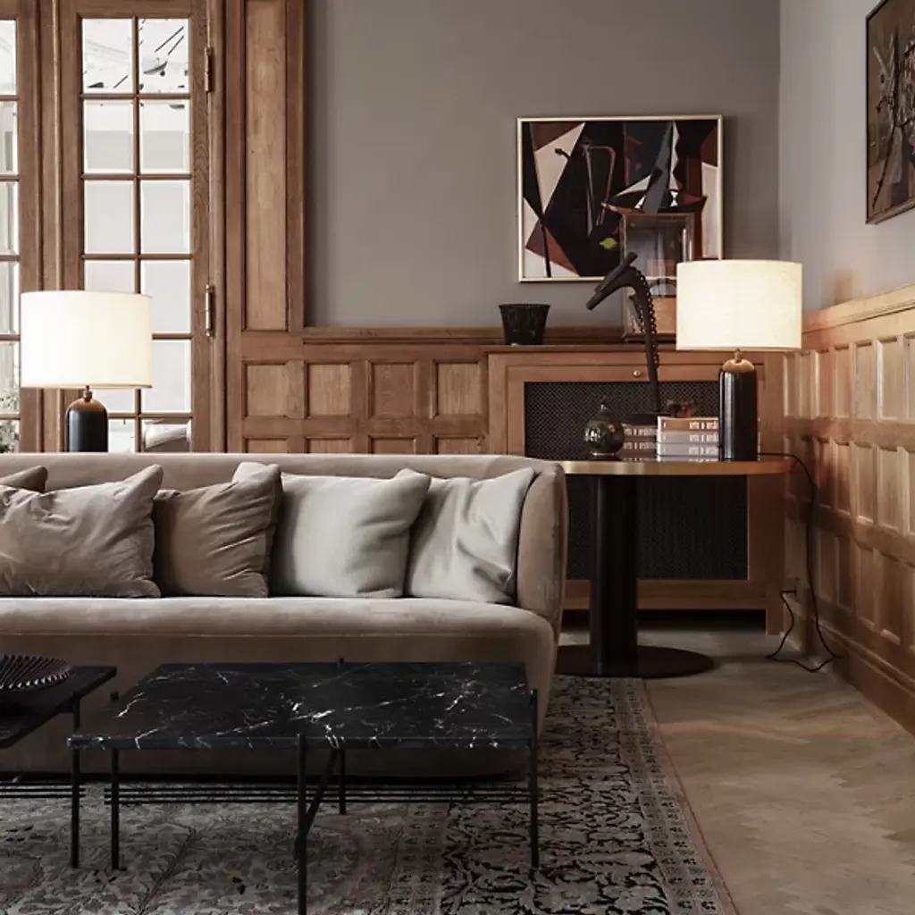 The sleek lines and unforgettable form of the Gravity Table Lamp from GUBI create an aesthetically pleasing contrast of strength and fragility. Designed by Space Copenhagen, a design studio collaboration of Signe Bindslev Henriksen and Peter Bundgaard Rützou, it incorporates their experience in multiple mediums and design philosophy of balancing opposites. The lamp gets its name from the juxtaposition of a robust cylindrical base with a single socket and the light, airy drum shade that floats above it, easing excess glare into a warm glow that reflects across the fixture’s smooth base below.