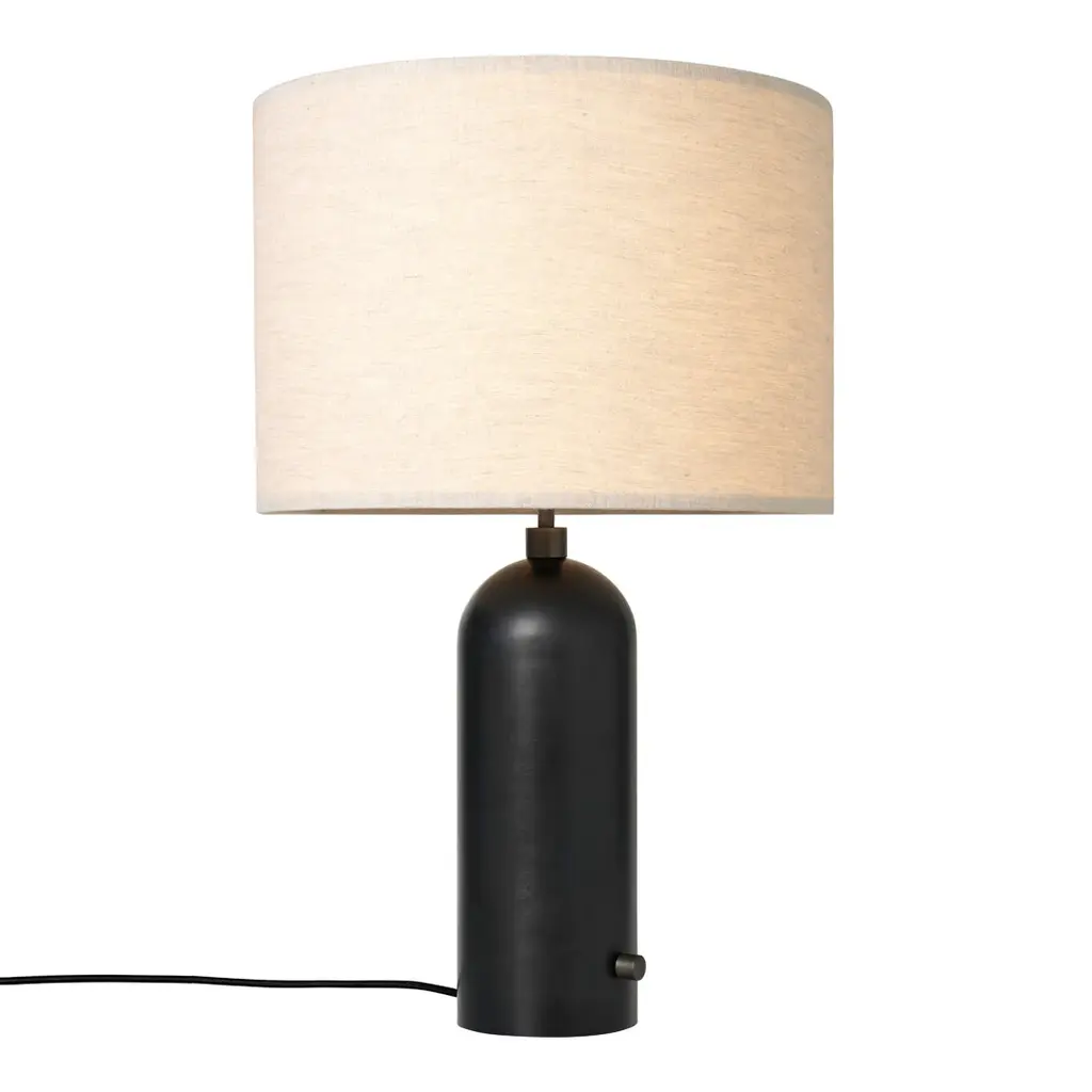 The new Gravity Collection designed by Space Copenhagen, consisting of a table lamp and a floor lamp, is aesthetically contrasting strength and fragility. Taking its name from the lampâ€s distinctive balance between the anchoring of the heavy, cylindrical base and the lightweight, airy shade, it beautifully merges into a sculptural whole. Blending understated elegance, clean functionality and effortless in its own succinct and simple way, the Gravity Lamp gives an ambient and subtle light display and creates different moods and expressions depending on the choice of size and combination of materiality. Available with black marble, grey marble and blackened steel base. Shade available in white or canvas. Light dimmer on base. Switch on base.