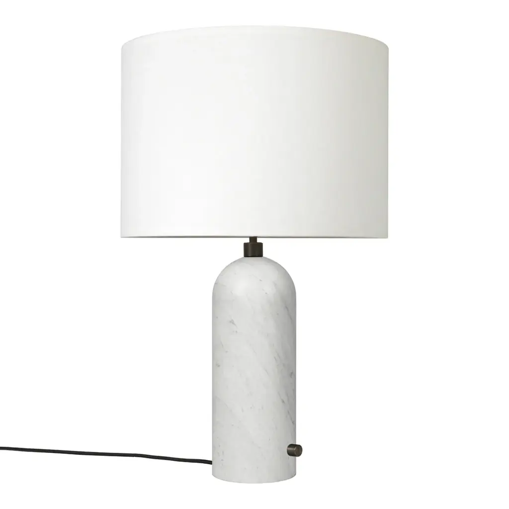 The new Gravity Collection designed by Space Copenhagen, consisting of a table lamp and a floor lamp, is aesthetically contrasting strength and fragility. Taking its name from the lampâ€s distinctive balance between the anchoring of the heavy, cylindrical base and the lightweight, airy shade, it beautifully merges into a sculptural whole. Blending understated elegance, clean functionality and effortless in its own succinct and simple way, the Gravity Lamp gives an ambient and subtle light display and creates different moods and expressions depending on the choice of size and combination of materiality. Available with black marble, grey marble and blackened steel base. Shade available in white or canvas. Light dimmer on base. Switch on base.