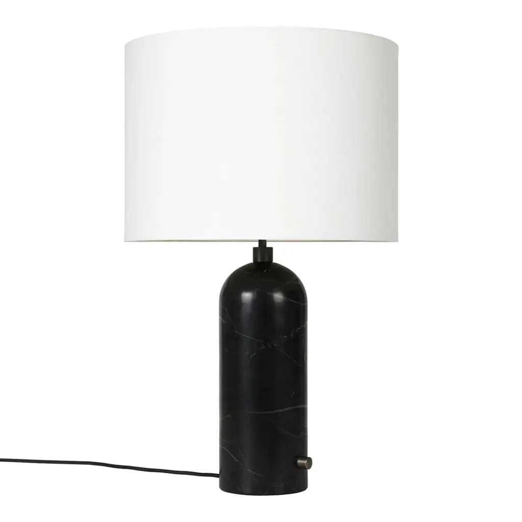The new Gravity Collection designed by Space Copenhagen, consisting of a table lamp and a floor lamp, is aesthetically contrasting strength and fragility. Taking its name from the lampâ€s distinctive balance between the anchoring of the heavy, cylindrical base and the lightweight, airy shade, it beautifully merges into a sculptural whole. Blending understated elegance, clean functionality and effortless in its own succinct and simple way, the Gravity Lamp gives an ambient and subtle light display and creates different moods and expressions depending on the choice of size and combination of materiality. Available with black marble, grey marble and blackened steel base. Shade available in white or canvas. Light dimmer on base. Switch on base.