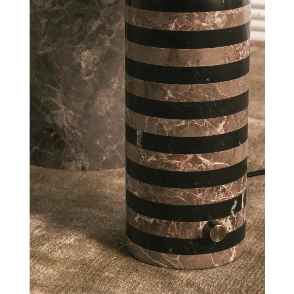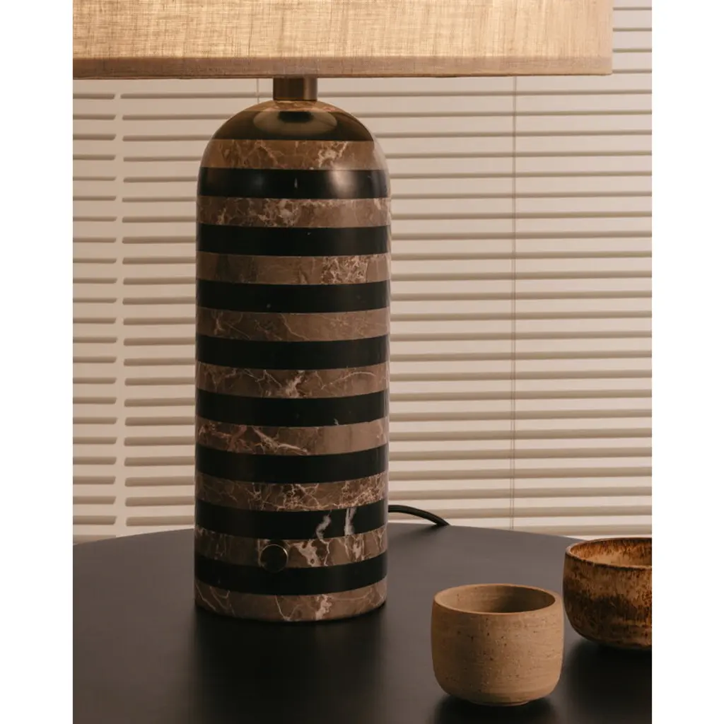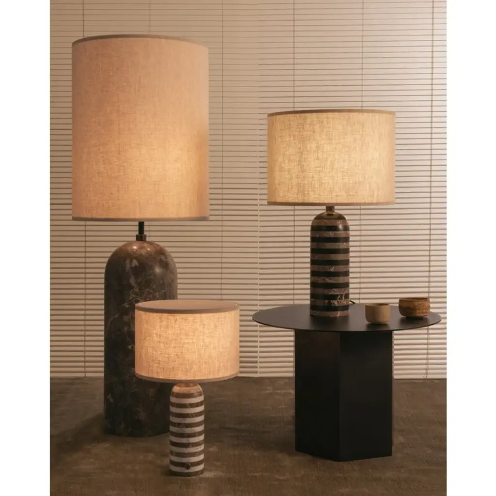 GUBI's Gravity Upcycled-Marble Edition table lamp captures attention with its striped base made from upcycled marble. The two-tone base is crafted from surplus marble pieces, precisely cut, glued together, and polished to perfection. The interplay of darker and lighter stone, each with its unique vein patterns, creates a striking effect, further enhanced by the airy, translucent canvas shade. Designed by Space Copenhagen, the esthetics of the Gravity collection are based on soft but precise cylindrical shapes. The well-balanced geometrical elegance is a perfect addition to many kinds of interiors and especially larger spaces. Gravity's lightly-colored fabric shade provides a gentle light and also highlights the texture of the marble base. Gravity Upcycled-Marble Edition lamps are exclusively available at Finnish Design Shop.