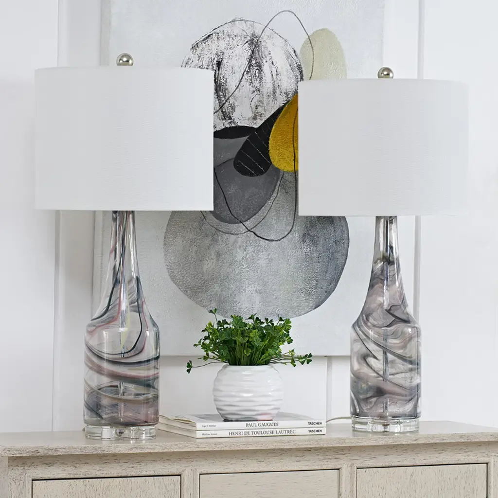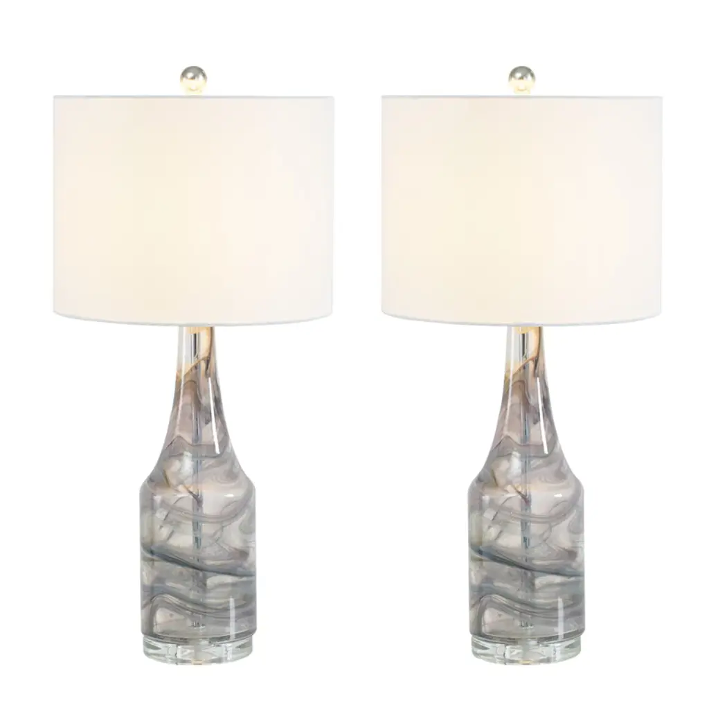 Add a touch of modern elegance to your space with the Korando 29" Standard Gray Glass Table Lamp Set. Featuring sleek gray glass bases and classic silhouettes, this lamp set delivers soft, ambient lighting while complementing a variety of home decor styles. Perfect for living rooms, bedrooms, or entryway consoles, these lamps combine style and functionality effortlessly.