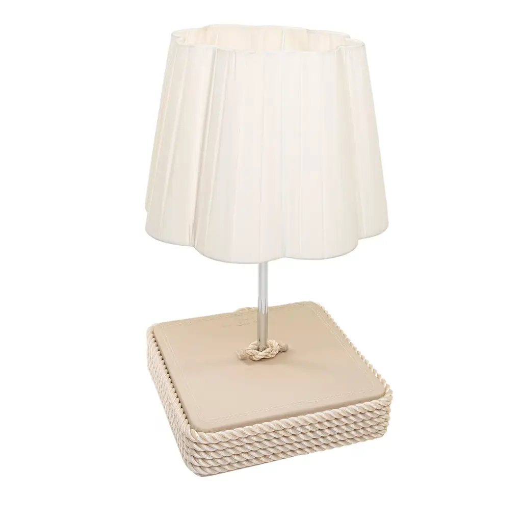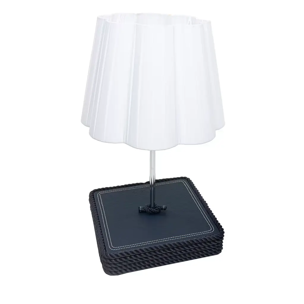 The use of materials such as rope and the starfish element applied onto the lamp's base immediately convey the marine inspiration behind this table lamp. The wooden body is covered with finely intertwined gray ropes with a square top flaunting a leather upholstery matching in color. The pleated pure-white lampshade elegantly casts the light in the surroundings.