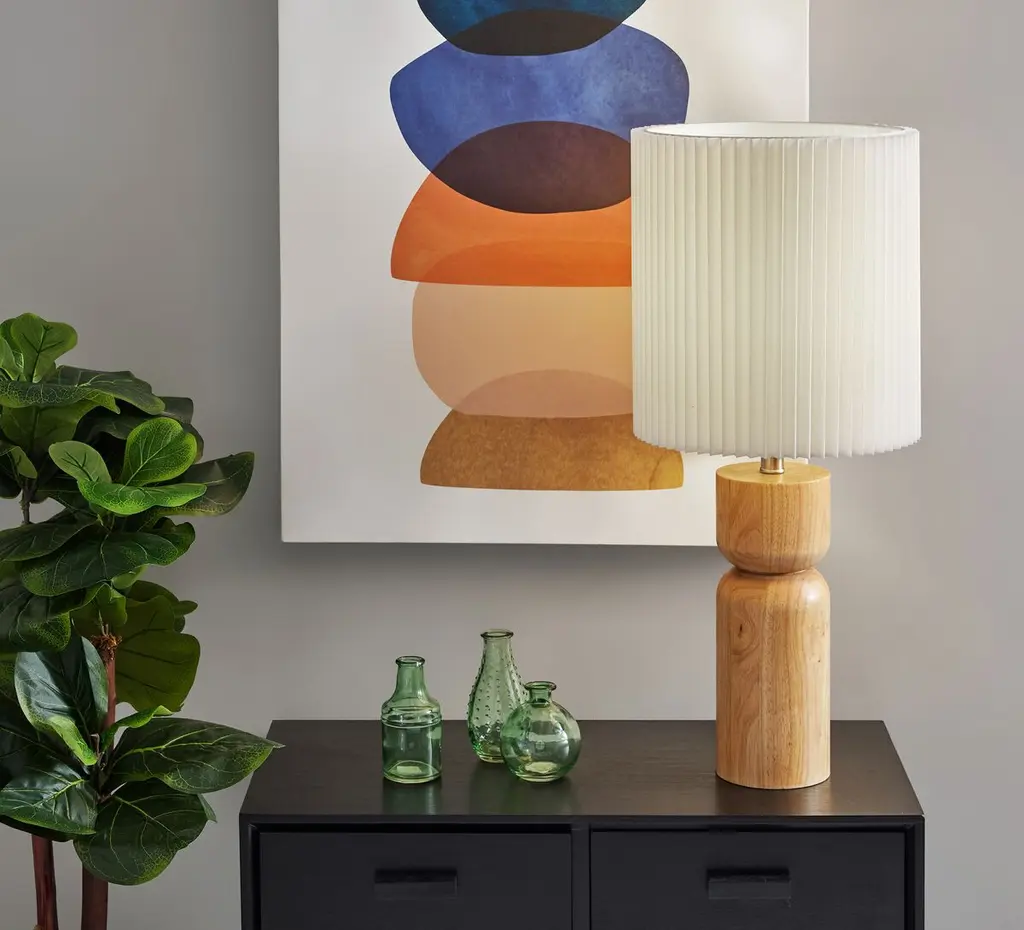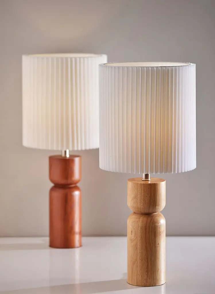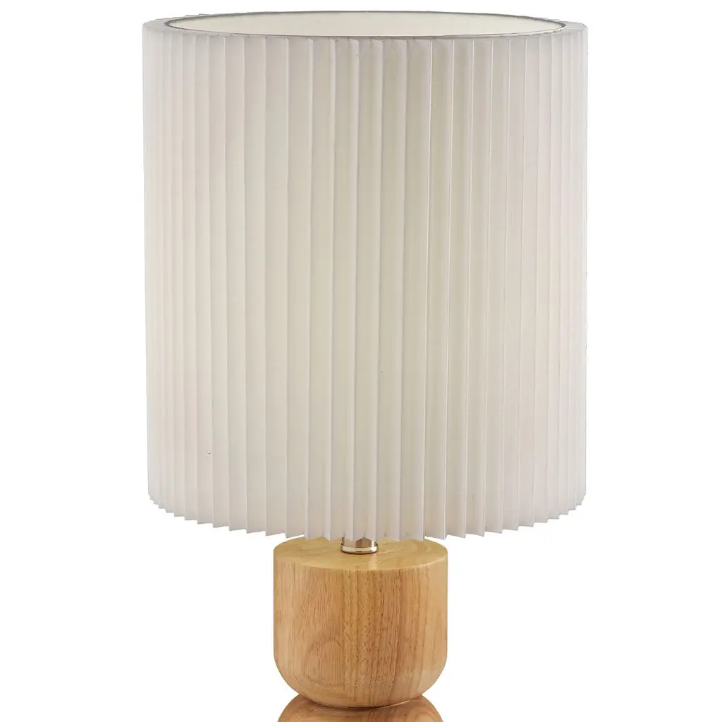 Featuring elegant lines and a wood base, this table lamp effortlessly blends modern and rustic styles. The wood base, complemented by a contrasting metal pole, supports a graceful pleated fabric drum shade. Operating with a rotary socket switch for convenient on/off control of the 100W bulb, this lamp comes with a clear 5' cord for power. Available in both a rich walnut finish with an off-white shade and a light natural finish with a white shade, it's a versatile choice for any space.