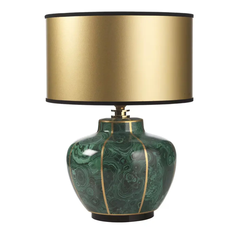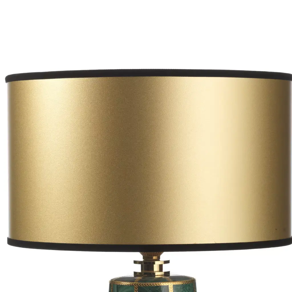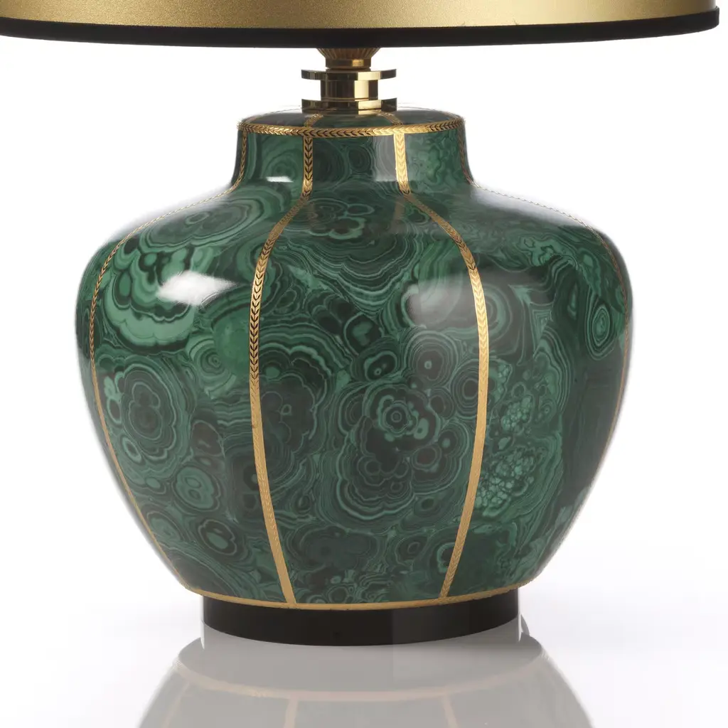 This sophisticated lamp has a structure in porcelain whose sinuous shape, finished in vivid green, is highlighted with vertical decorations in pure gold.