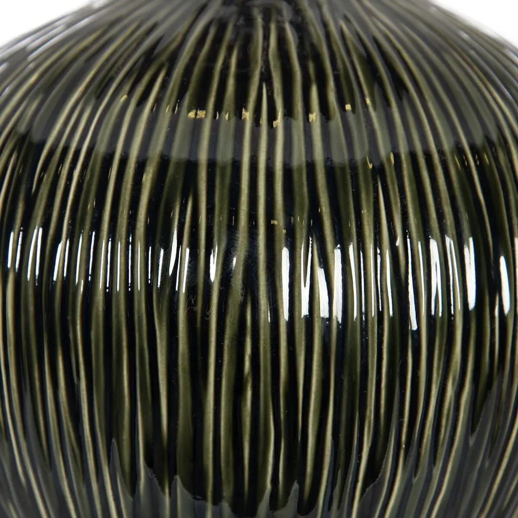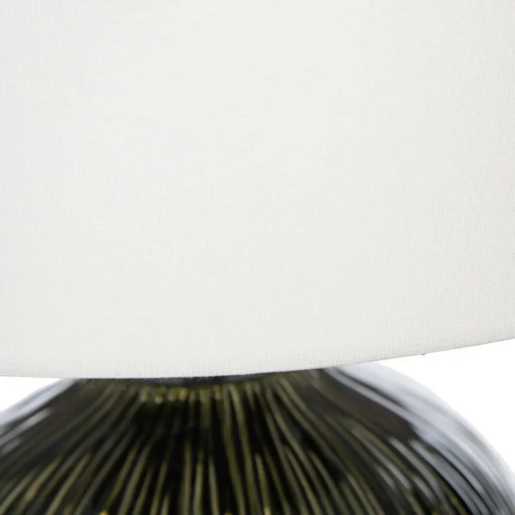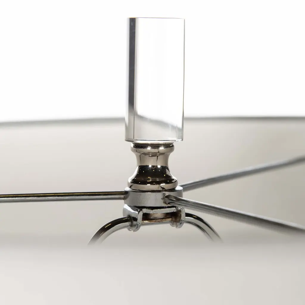 The glossy rounded base of this lamp has a handcrafted look with its two-toned vertical scores in the finish. Elegant clear crystal accents grace the base, top, and finial of the linen drum shade for a very tailored profile. Three-way lighting allows you to customize your lighting for any occasion.