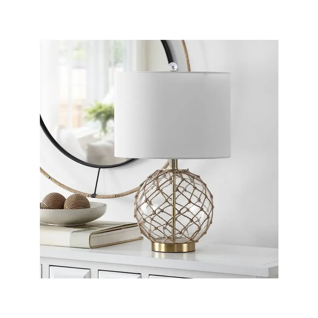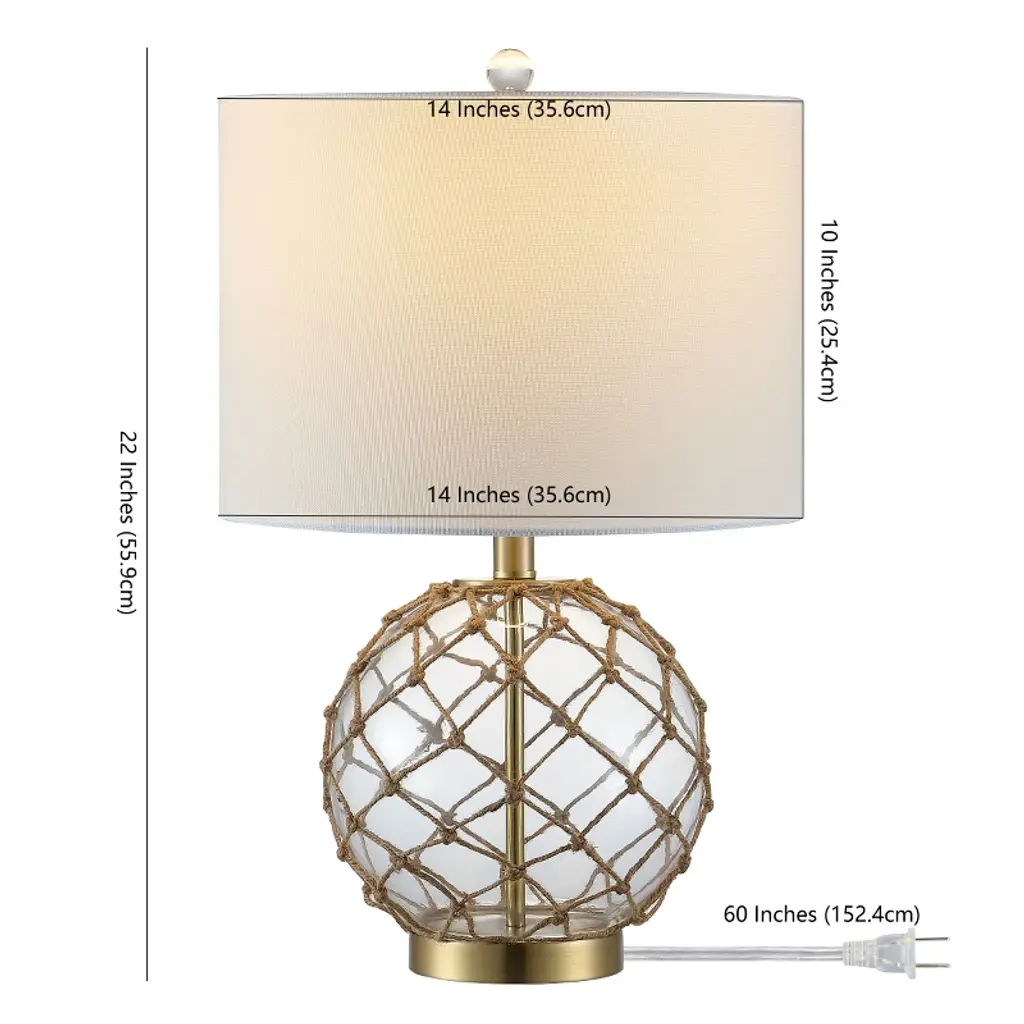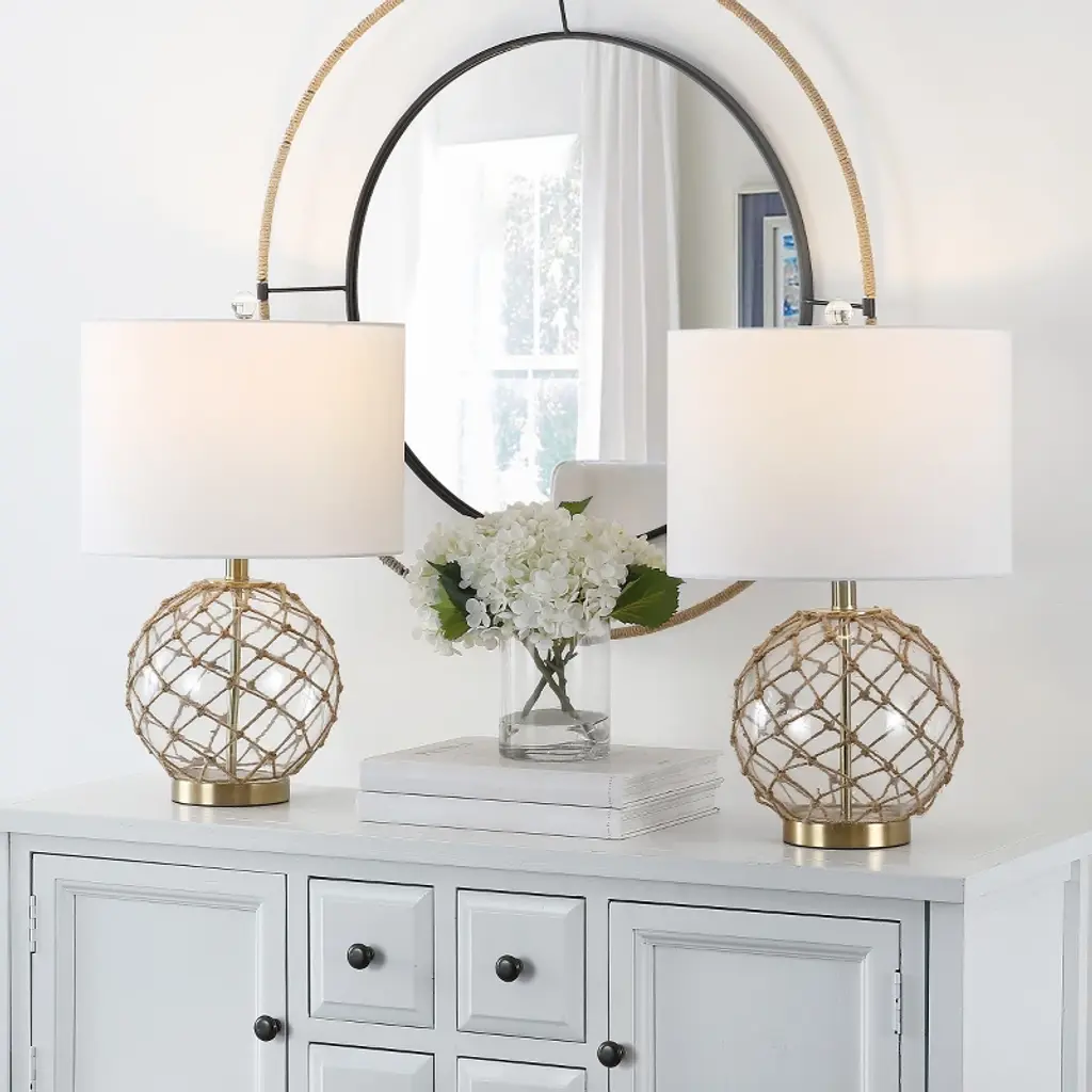 Illuminate your space with the captivating Gremeli 22 inch glass table lamp set. This set of two lamps effortlessly combines elegance and functionality, featuring a natural and clear color palette that seamlessly blends with any decor. Crafted with an exquisite mix of glass, rope, and fabric, each lamp is designed to create a warm and inviting atmosphere in any room. The natural rope detailing wraps around the glass base, adding a touch of rustic charm while the fabric shade ensures a soft, ambient glow. Perfect for enhancing your living room, bedroom, or study, these lamps not only provide light but also enhance the aesthetic appeal of your home. Elevate your interior with the Gremeli table lamp set and enjoy a beautifully lit environment.