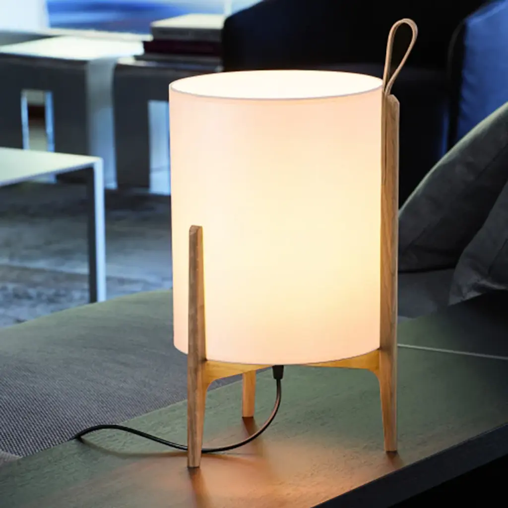 Oak table lamp finished in satin varnish. Linen lampshade and natural leather handle. Features
