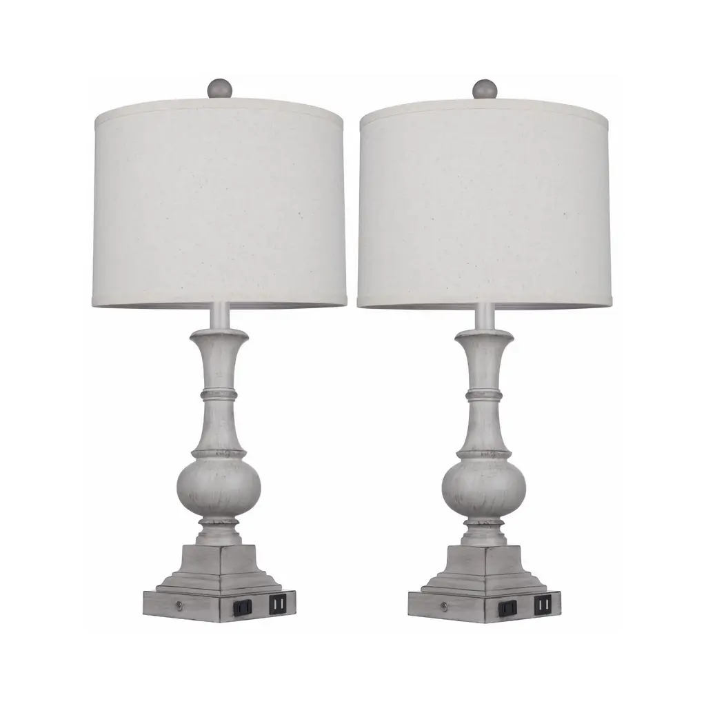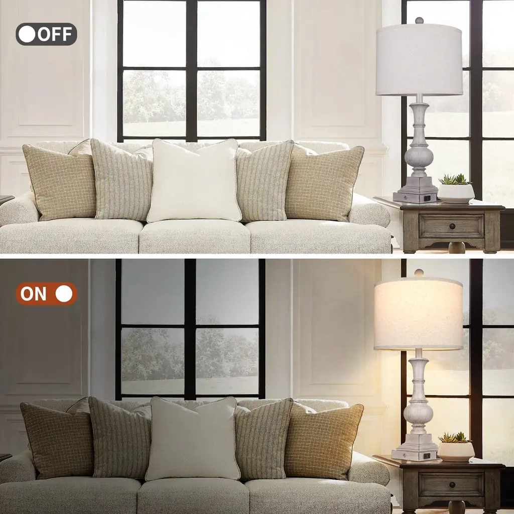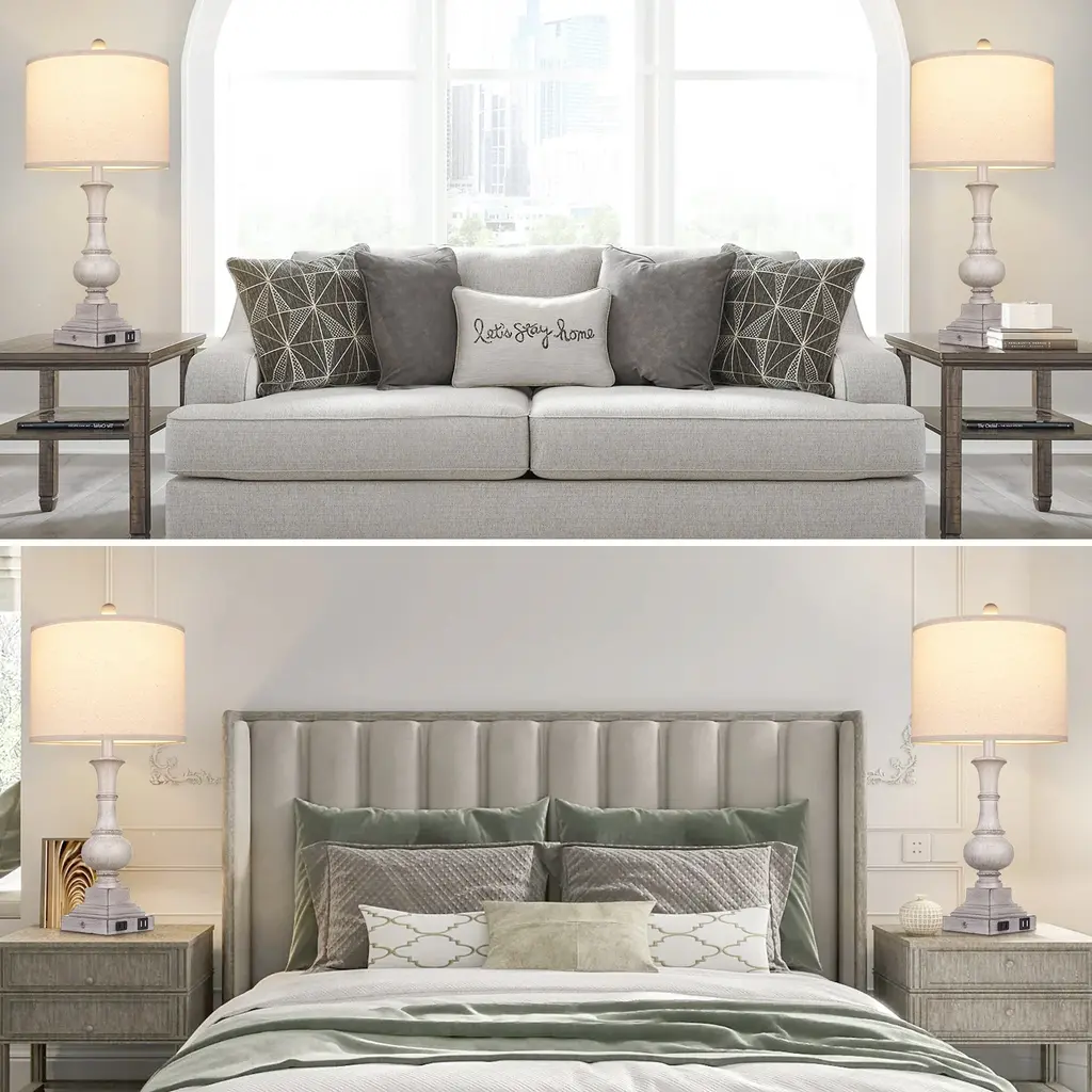 The table lamp set are made of grey resin. It pairs with the regular drum style lampshade. And the shade can be adjusted kinds of lighting effects by 3-way LED bulbs. For its bulbs, it supports 800 Lumens, warm-white 2700K - 3000K. And the bulb base is standard E26. That's to say its easy to replace the bulb. About the lamp switch, it is placed on the lamp base. And you can touch the stainless steel point to control it. The bulb can be adjusted with 3 different bright effects. It takes care of your real use experience. No matter you place it at bedside, living room or bedroom, just touch different times for the appropriate lighting. Furthermore, the lamp base integrates extra USB charging ports and AC outlet. It can conveniently power your smart devices at your hand. Additionally, its base is tetragonal, non-slip design and enhances the safety of using.Overview of features: