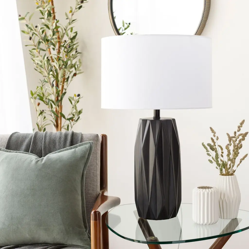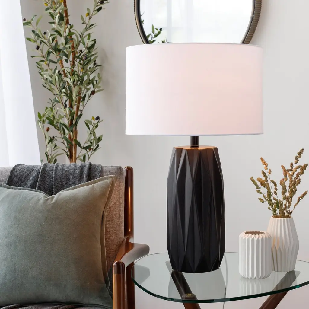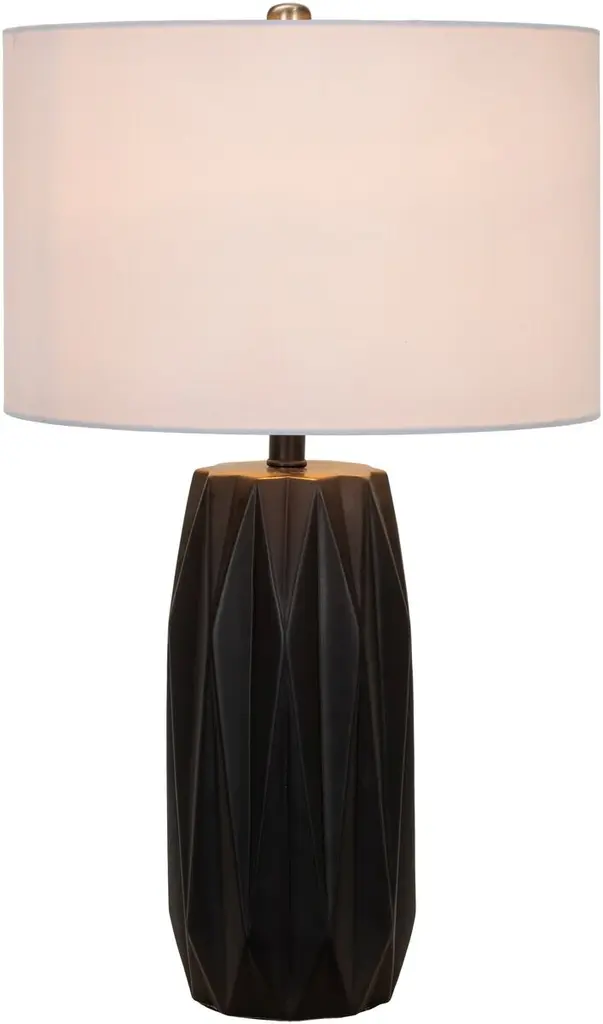 A black glaze heightens the drama of this table lamp's origami-like ceramic body.