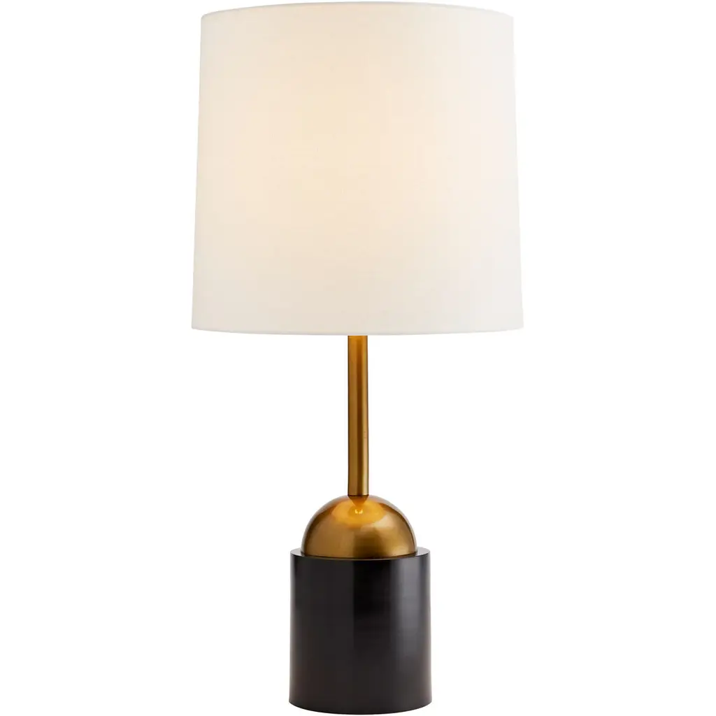 A sculptural approach to basic geometry, the Grove is subtly straightforward. The aluminum foundation features dueling finishes of antique brass and bronze for a unique take on color blocking. A simple statement piece for virtually any space. Topped with an off-white linen drum shade with white cotton lining an antique brass cylinder finial.
