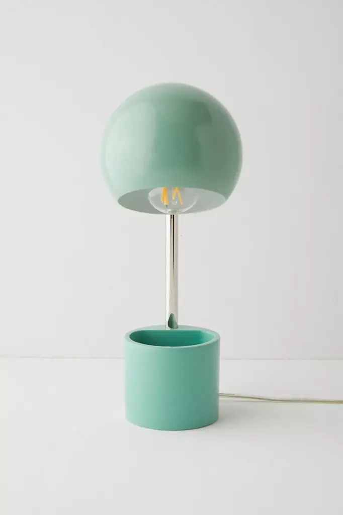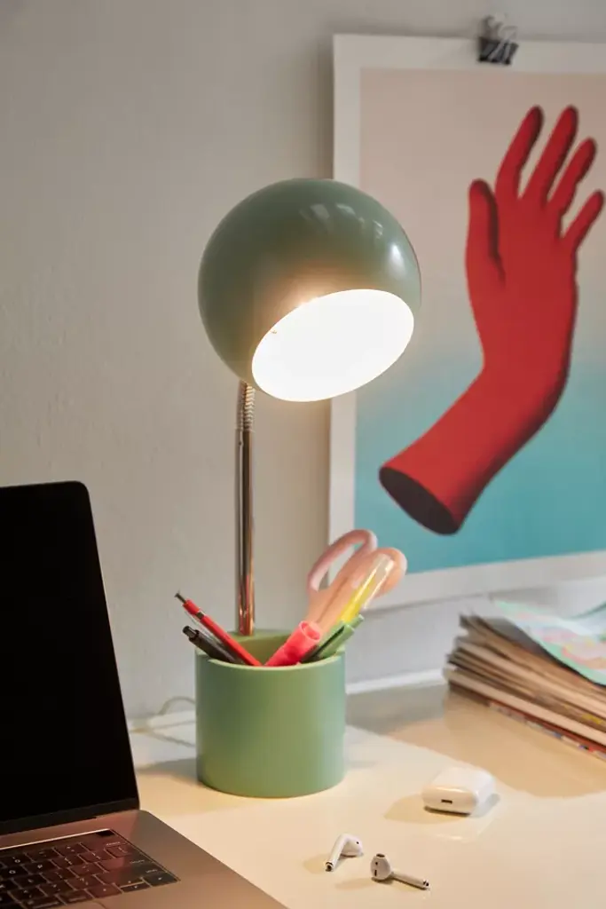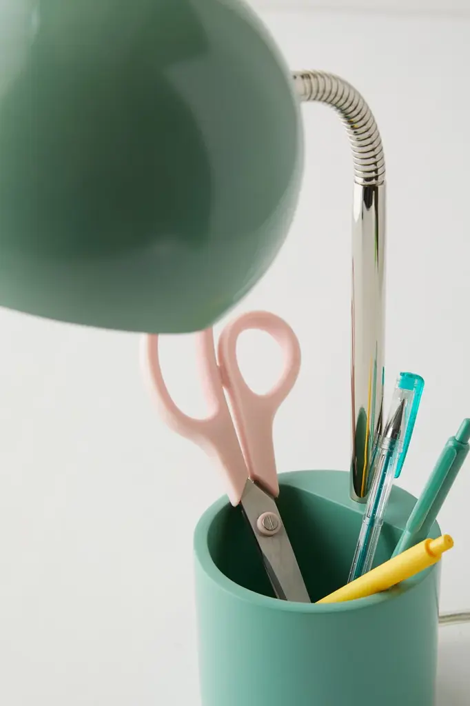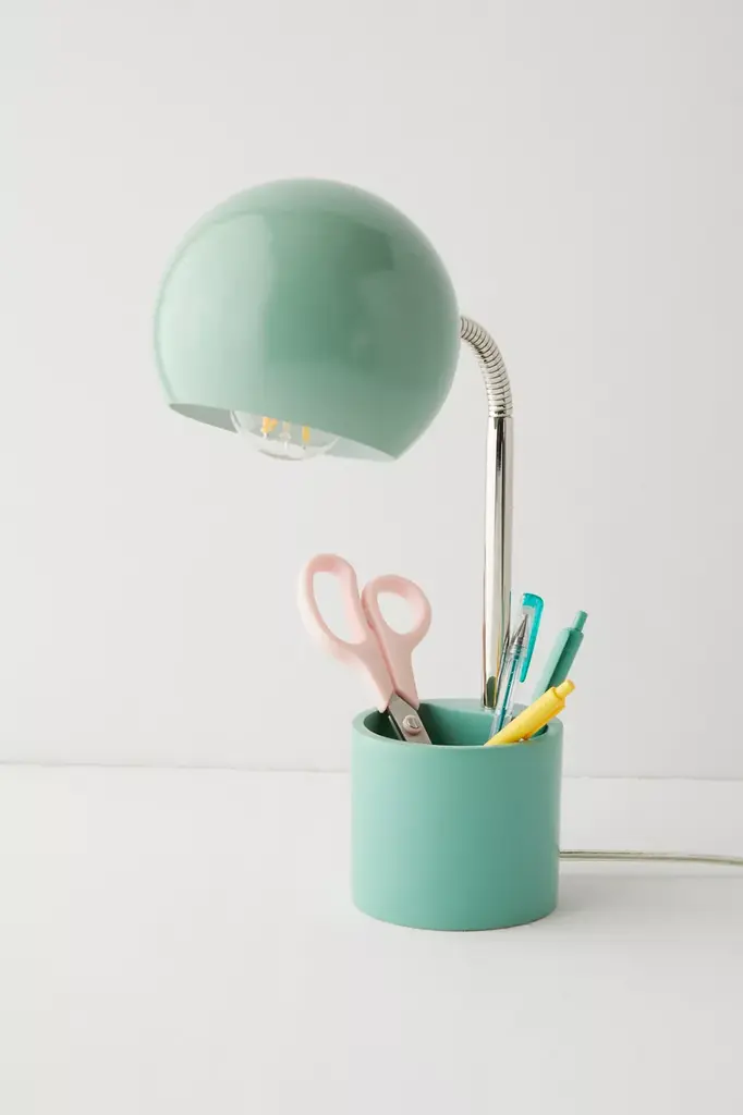 Get it done with this gumball shade desk lamp, featuring a built-in storage cup base and flexible neck for adjustable light direction. Perfect for storing pens and desk supplies so you have every essential on hand when the creative spark hits. Plugs in to power on; compact fluorescent compatible. Available exclusively at Urban Outfitters.