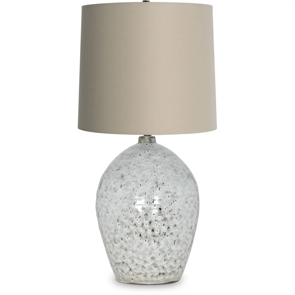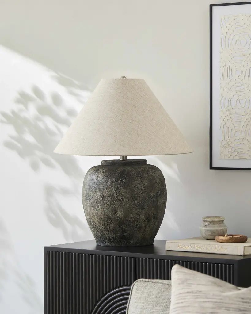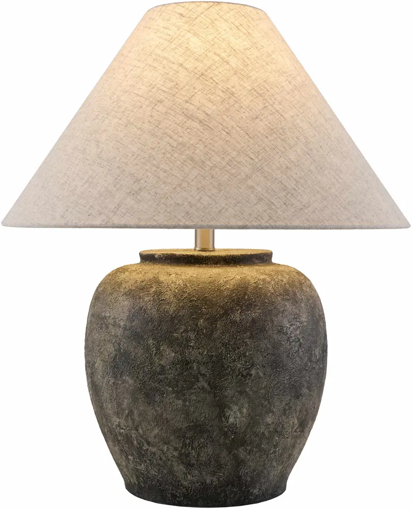 Collection: Gurgurnica Colors: Dark Brown, Peach, White, Metallic - Nickel, Translucent Material: Body: Cement / Shade (Outside): Linen / Shade (Inside): Metal / Finial: Iron Styles: Transitional,Bohemian Made In: China Lighting Type: Accent Table Lighting Shade Material: Linen, Metal Shade Color: White, Wheat Cord Length: 6' Switch Type: 3-Way Number of Bulbs: 1 Socket Type: E-26 Bulb Wattage: 150W