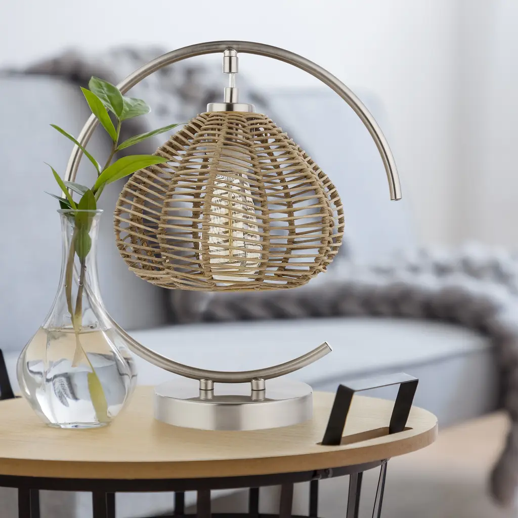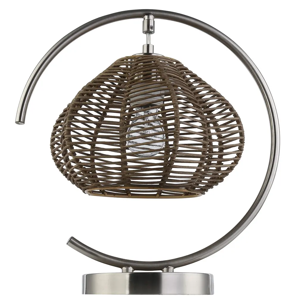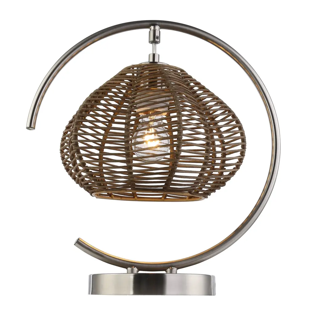 This geometric table lamp with a hanging rattan shade makes a truly unique addition to your interior decor. The lamp showcases a brushed nickel-finish metal base with an open crescent ring, and a round tan rattan shade hangs from the top of the ring. It adds soft lighting to your space with a 60-watt E26 bulb (not included) and is also LED compatible, and the 60-inch power cord with an in-line switch allows for stress-free placement on any side or console table. Effortlessly eye-catching, this table lamp makes an easy pairing with your existing Bohemian or beach-style decor.