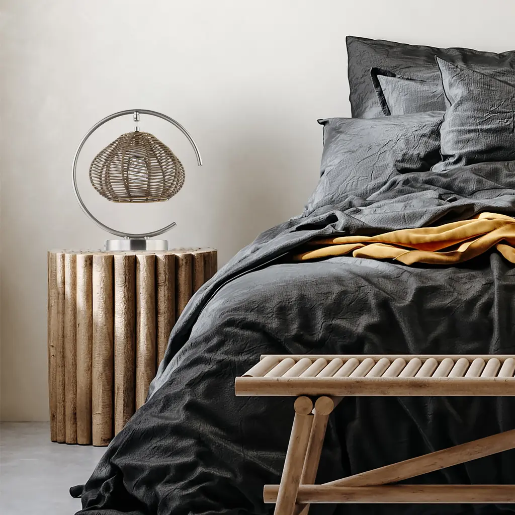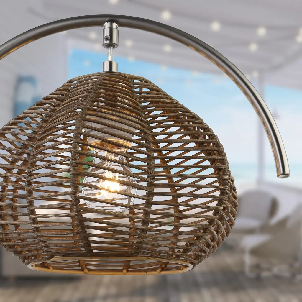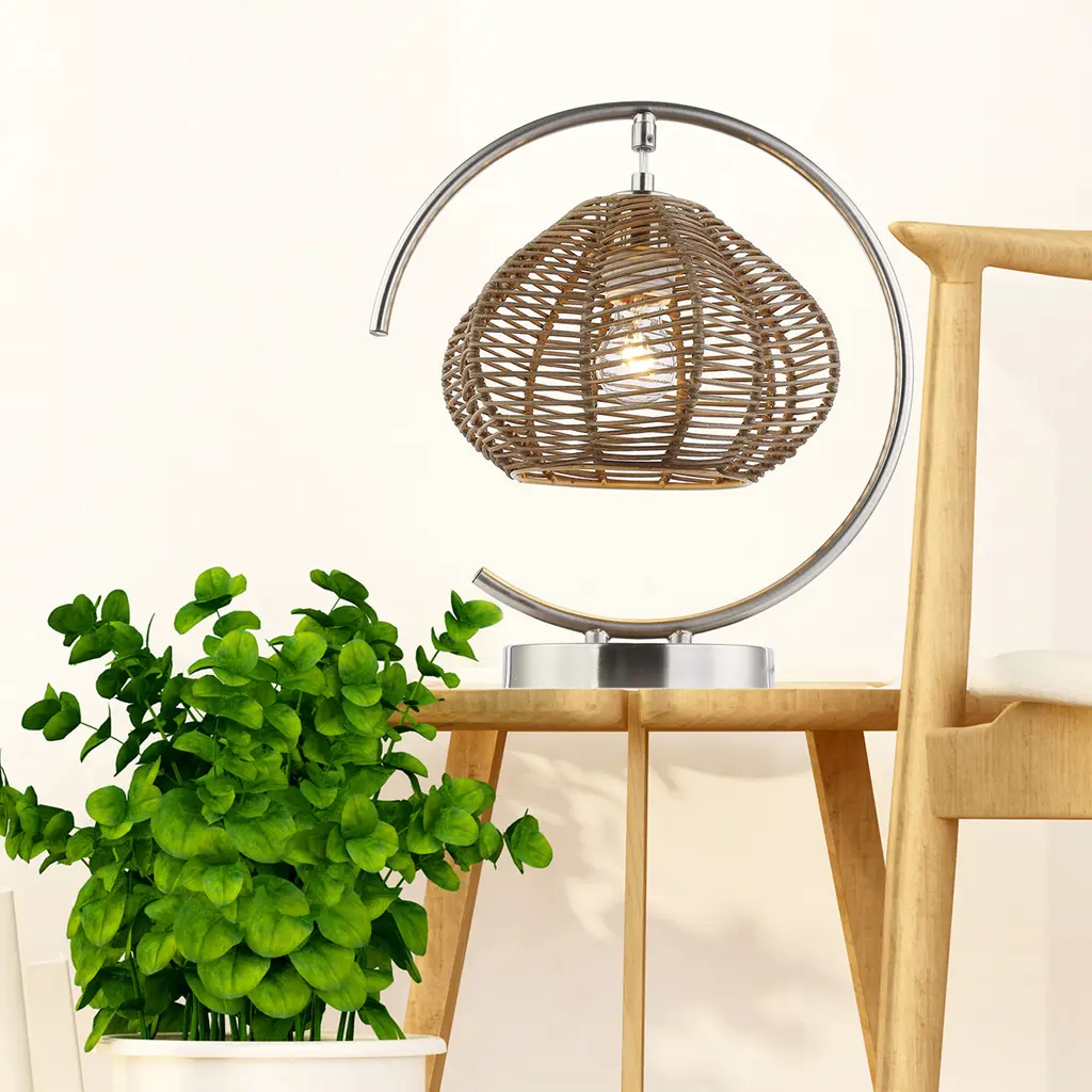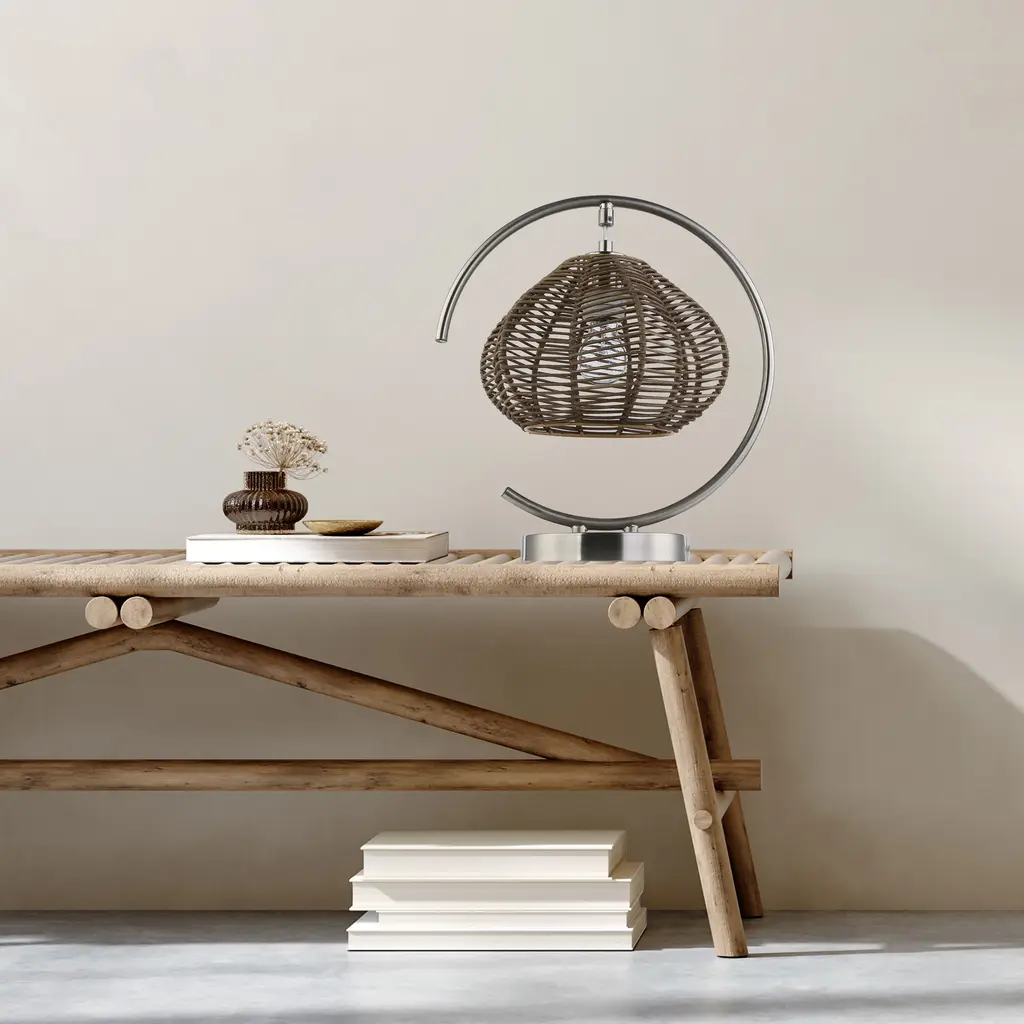 This geometric table lamp with a hanging rattan shade makes a truly unique addition to your interior decor. The lamp showcases a brushed nickel-finish metal base with an open crescent ring, and a round tan rattan shade hangs from the top of the ring. It adds soft lighting to your space with a 60-watt E26 bulb (not included) and is also LED compatible, and the 60-inch power cord with an in-line switch allows for stress-free placement on any side or console table. Effortlessly eye-catching, this table lamp makes an easy pairing with your existing Bohemian or beach-style decor.