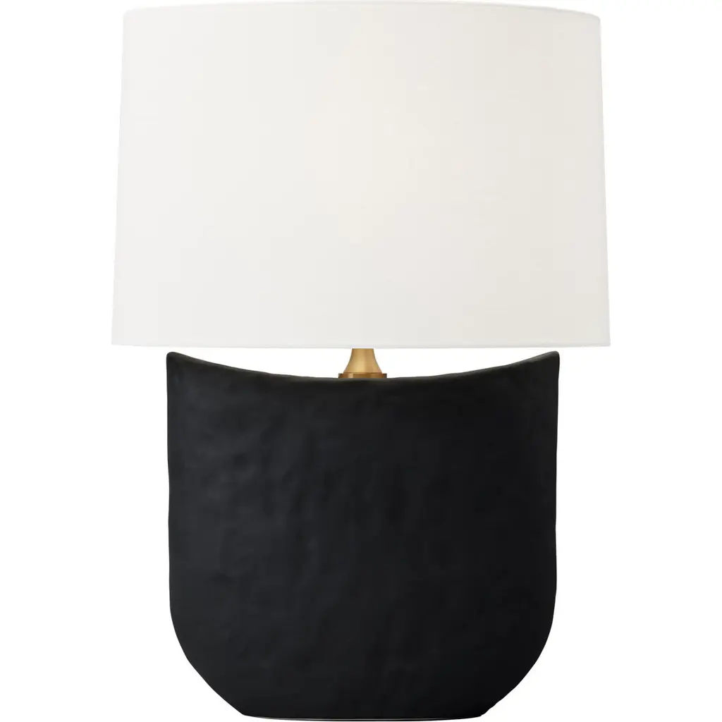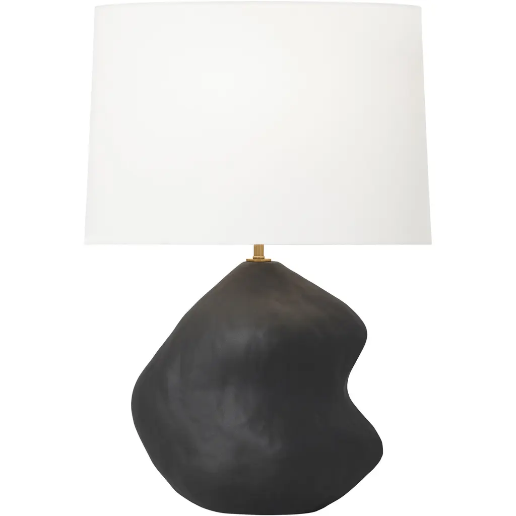 The Cenotes one light table lamp in rough black by Hable is hand built that displays organic indentations. Cenotes embodies shapely, textural abstract forms and complementing shades of fine fabric. Sweeping shoulder and curved body gives a nice canvas to see the all of unique one of a kind indentations. CENOTES provides abundant light to your home, while adding unique style and interest.