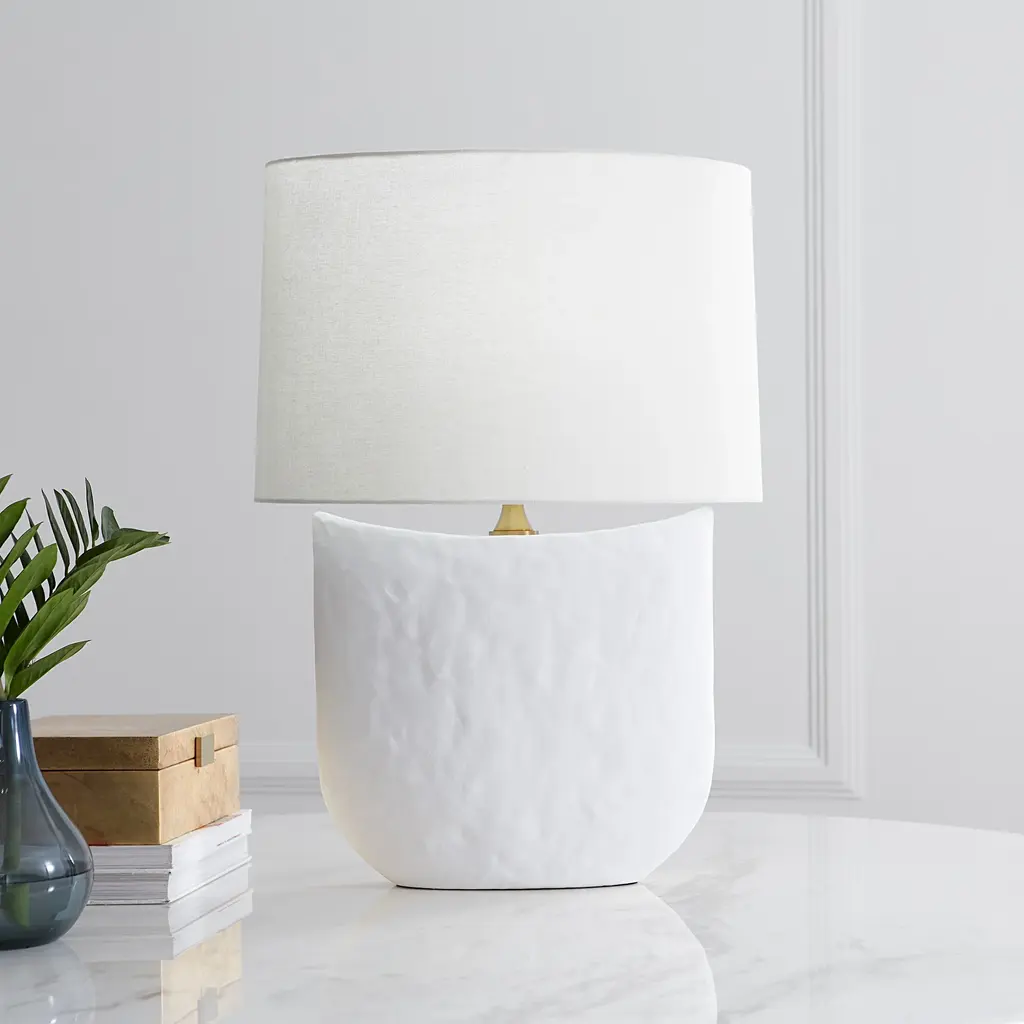 Introduce subtle, sculptural elegance to your space with the Hable Cenotes Table Lamp from Visual Comfort & Co. Its fluid design features a curving ceramic body and cylindrical fabric shade, providing a bright and appealing presence. The lamp's naturally-textured surface is enhanced by the direct downlight, making it an excellent addition to large desks and side tables. Highlights