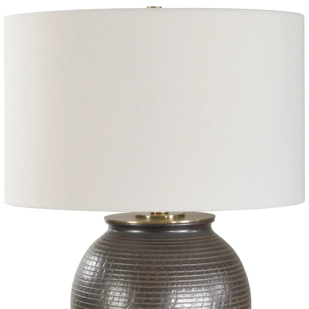 The Hadley Table Lamp is a stunning blend of classic and contemporary design, featuring an urn-shaped ceramic base with a distinctive horizontal ribbed texture. Its dark bronze glaze exudes a soft industrial charm, while the brass-plated accents add a touch of elegance and refinement. Topped with a rounded hardback drum shade in crisp white linen, this lamp offers a perfect Silvan of style and sophistication, making it an exquisite addition to any space.