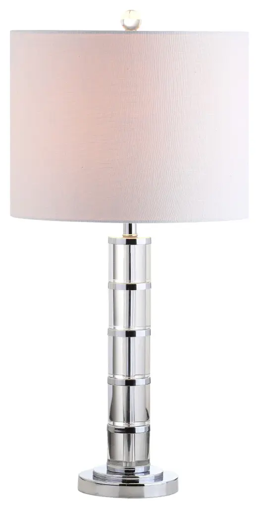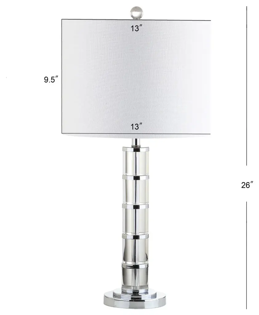 At 26" tall, this lamp adds a decorative, modern element to any room. With the warm glow of an LED bulb reflecting off its chrome and pillar base, its the perfect solution for when a room needs a touch of contemporary style and functionality in a scale that harkens back to antique oil lamps. Topped with a chrome finial and white linen drum shade, it packs big style in a scale that packs some stature. -Crystal and chrome create alchemy of perfect modern design in this 26" table lamp-100% cotton hardback drum shade-60" silk cord with standard USA 2-prong plug -On-off switch on socket-Takes one maximum 100 watt or equivalent bulb -Eco-friendly 9W LED bulb included-UL Listed-Color: Clear/chrome with white shade-Body Material: Crystal-Base Material: Iron-Finial Material: Crystal-Finial Color: Clear-Harp Color: Silver-Includes: One (1) lamp(s)-Minor Assembly Required-Lamp: 26 inches high x 13 inches wide x 13 inches deep-Shade: 9.5 inches high x 13 inches wide x 13 inches deepAbout us: You see a lamp.We see a decorative work of art.A perfectly curved shade casts a dramatic shadow on a floor. A silk cord you never want to hide. LED lightbulbs: as easy on the environment as they are on the eyes. The JONATHAN Y Lighting collection considers every detail from impeccably sourced materials to designer styling. And our prices are so attractive, we''ve transformed a functional necessity into a fashion accessory.JONATHAN Y Lighting a fashion revolution in home decor.