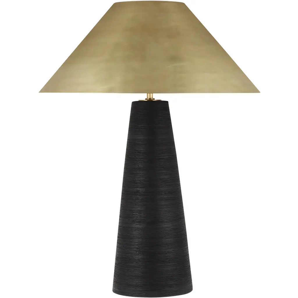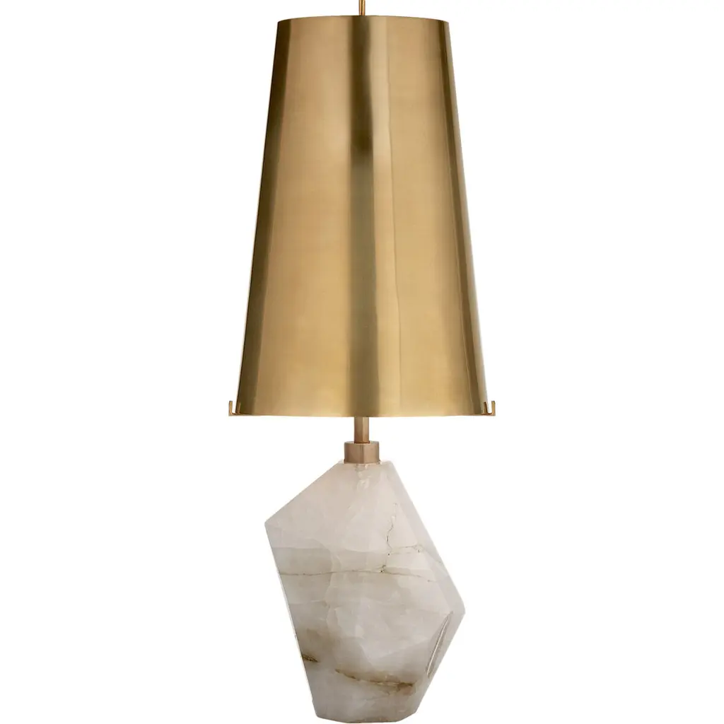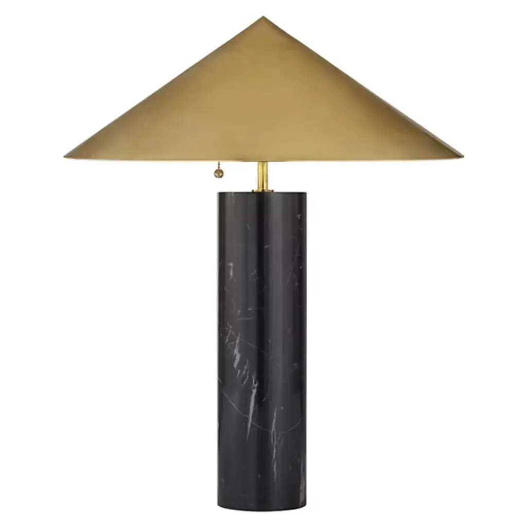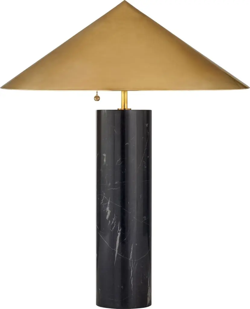 Bring an elegant impact to side tables and workspaces alike with the natural contrast of the Halcyon Medium Table Lamp from Visual Comfort Signature, formerly known as Visual Comfort, Rising from an irregularly-faceted base of black marble, it seats a single strong lamp beneath a tall, flared brass shade that gentles bright glare to the sides. The smooth metal contrasts well with the natural surface of the marble, reflecting a focused wash of downlight that burnishes the base below.