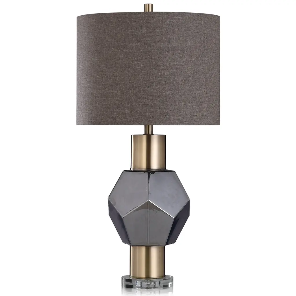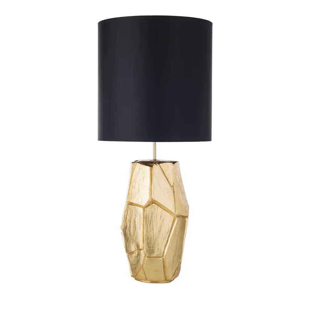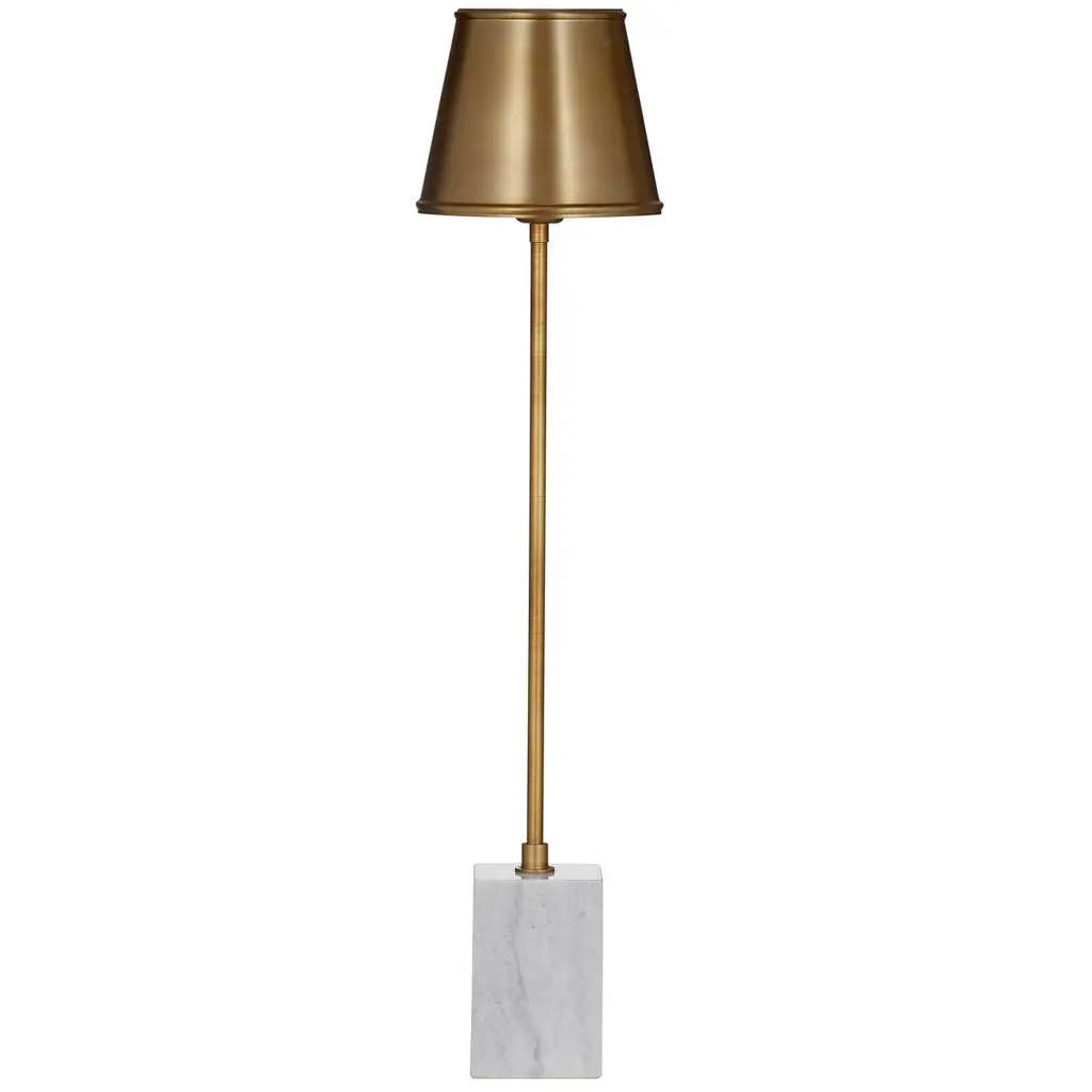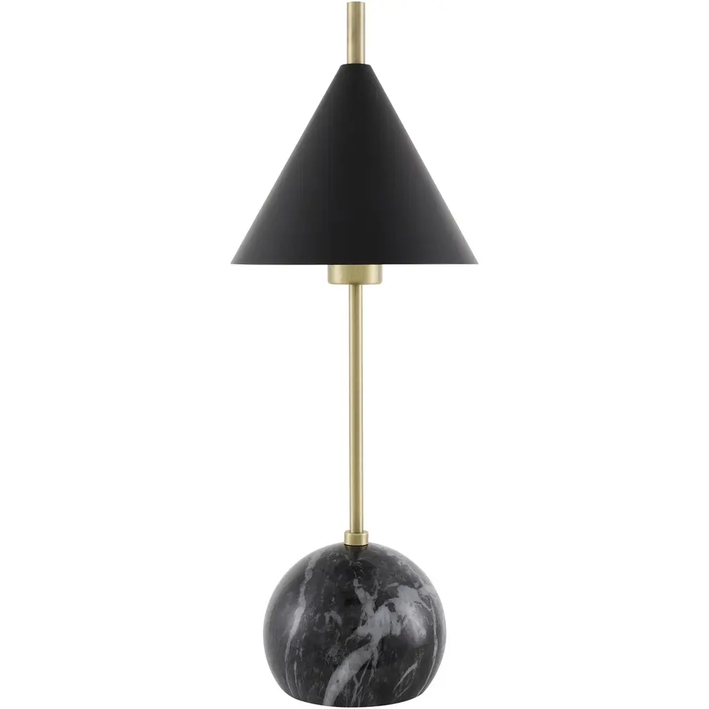 Bring an elegant impact to side tables and workspaces alike with the natural contrast of the Halcyon Medium Table Lamp from Visual Comfort Signature, formerly known as Visual Comfort, Rising from an irregularly-faceted base of black marble, it seats a single strong lamp beneath a tall, flared brass shade that gentles bright glare to the sides. The smooth metal contrasts well with the natural surface of the marble, reflecting a focused wash of downlight that burnishes the base below.