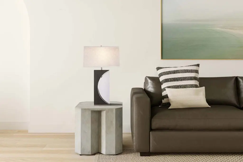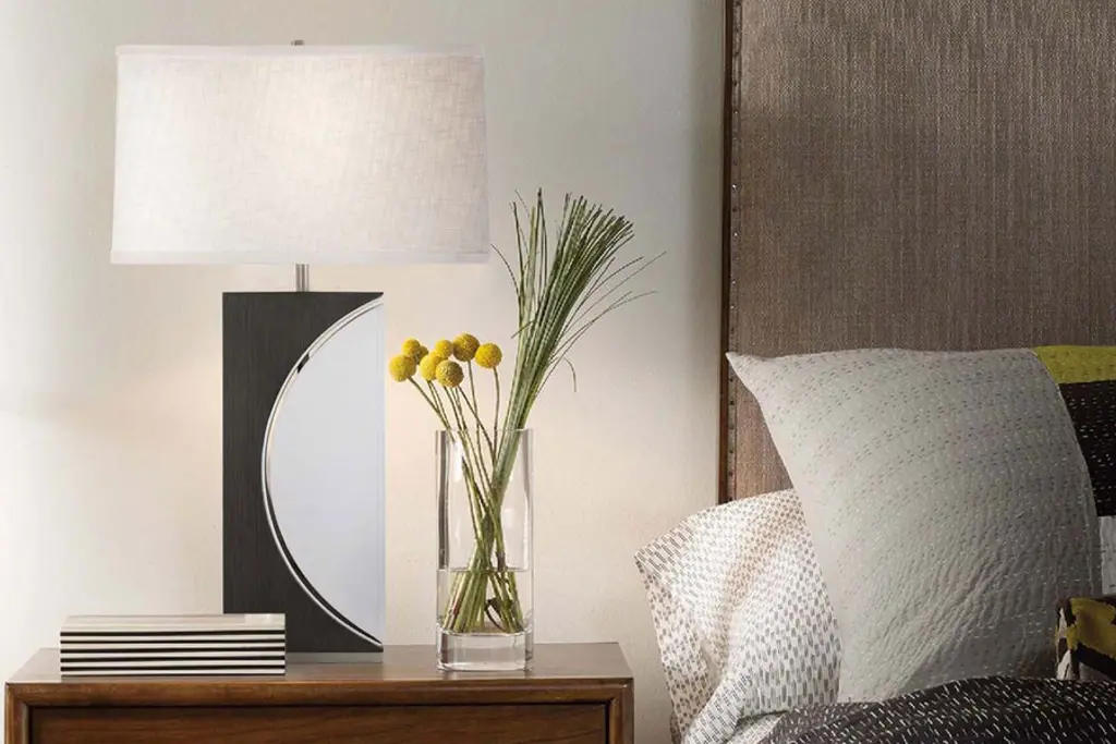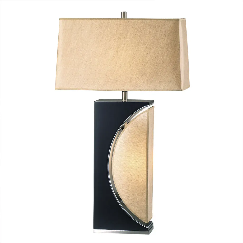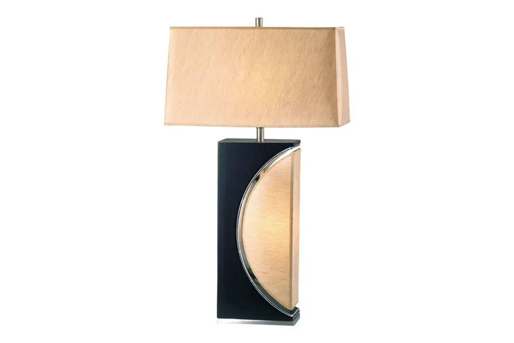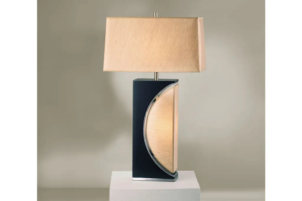 The Half Moon Table Lamp is a transitional luminary light made for those who appreciate a decorative element to their accent designs. It can be placed atop your bedside nightstands, living room end tables or used as a high-end desk lamp. It features an elegant combination of bold charcoal gray or dark brown with brushed nickel finish adorning its solid column frame. Clean geometric lines are complemented by its soft white linen shade. A perfectly placed crescent moon accent is internally illuminated providing a gentle glowing nightlight. It can be used by itself, in combination with the above primary light, or not at all. The choice is yours. No matter the time of day or night, it will brighten up your living space. It comes in a variety of colors for you to choose from.