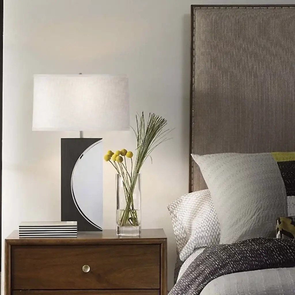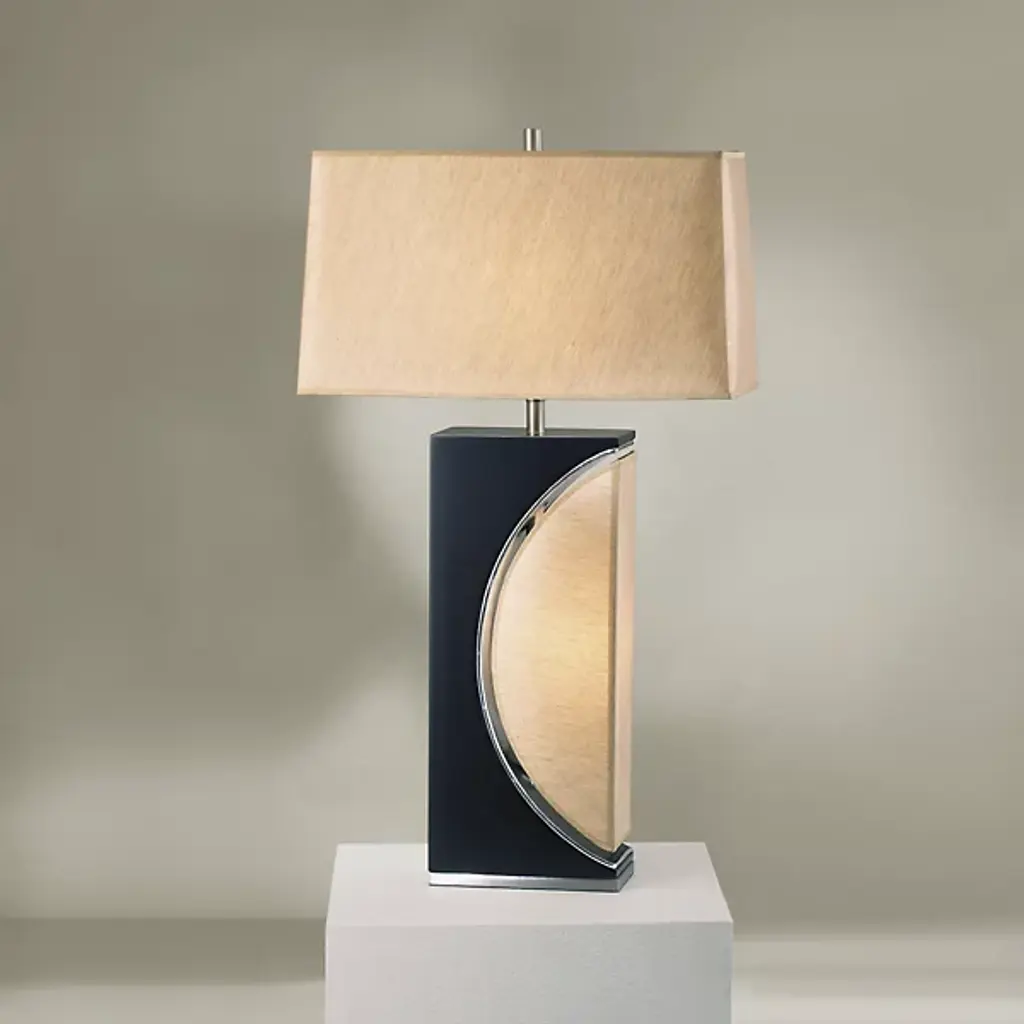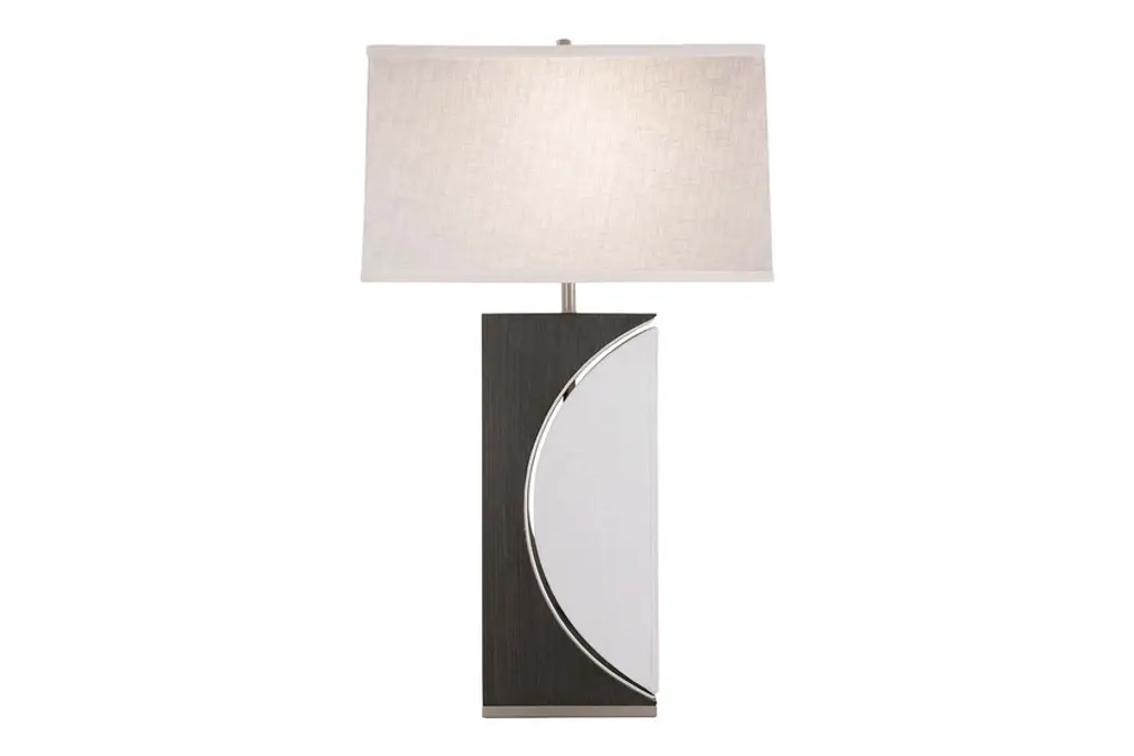 The Half Moon Table Lamp by Nova of California is a beautifully designed addition to spaces. A rectangular, wooden base with a handsome finish features a carved-out half-moon. Like the lunar body that inspired it, this table lamp offers a softly filtered, welcoming layer of illumination to spaces thanks to a crisp, rectangular linen shade perched at the top of its lovely form. A simple stem and finial pull this contemporary look together, lending spaces a balanced blend of form and function.
