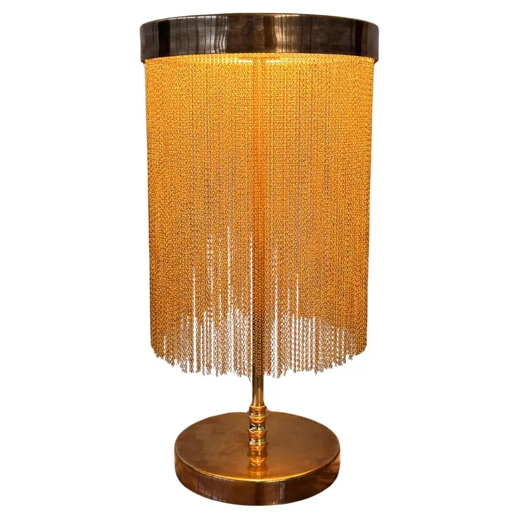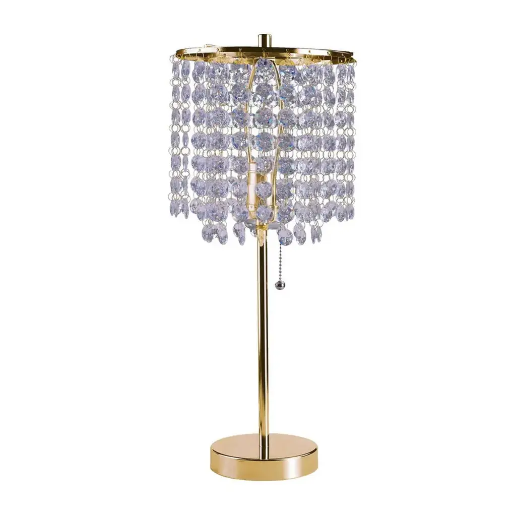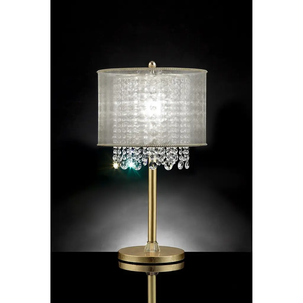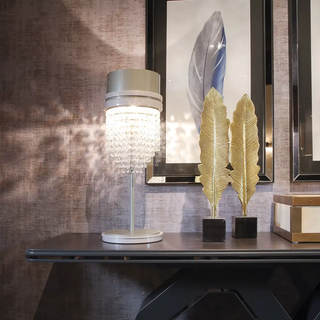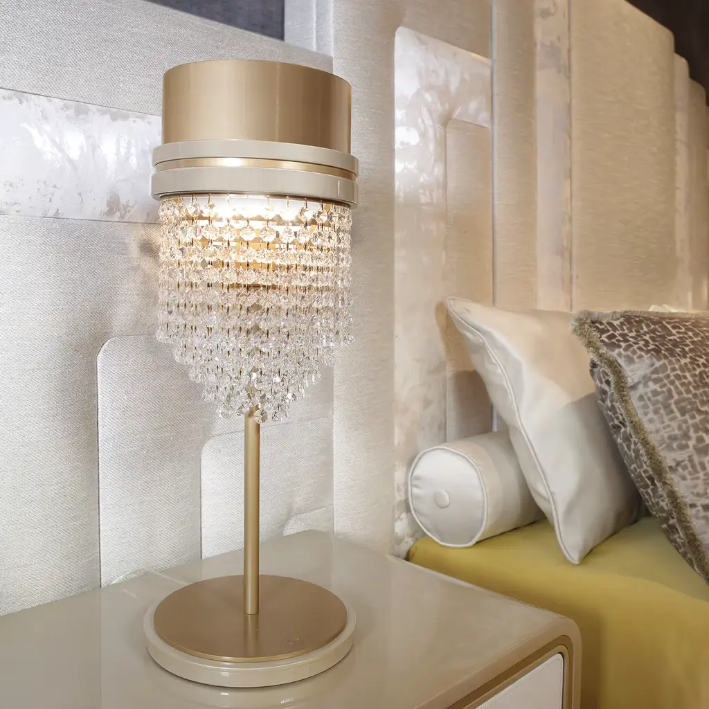 Hanami collection table lamp. Solid metal structure in gold satin finishing. Wooden details in polyester lacquered pearl champagne high gloss finishing. Swarovski chains on top.
