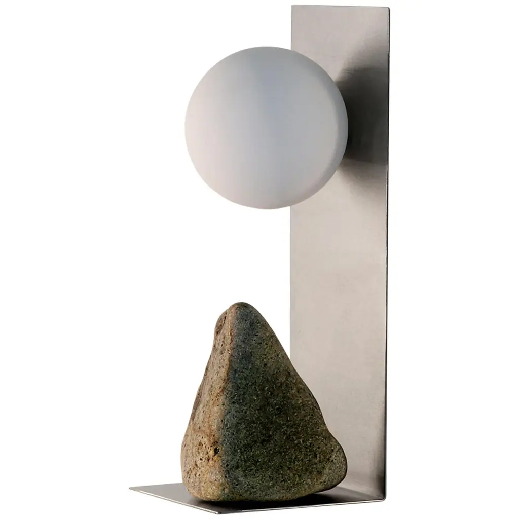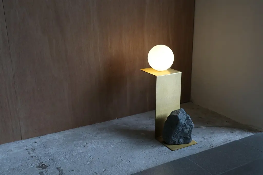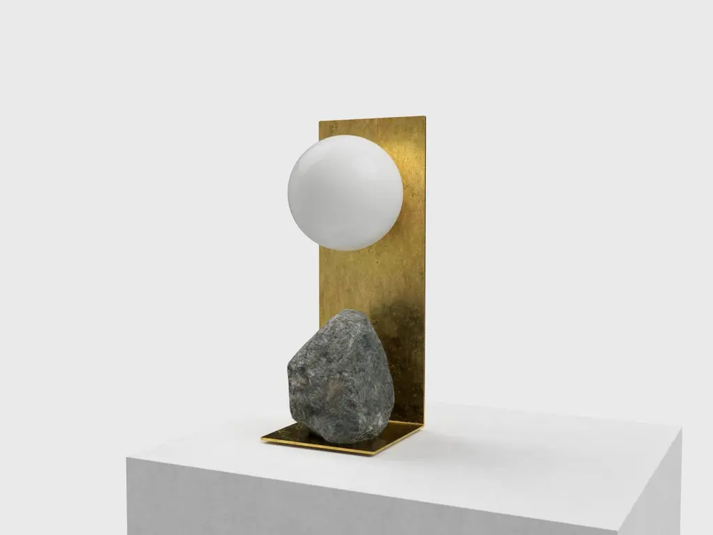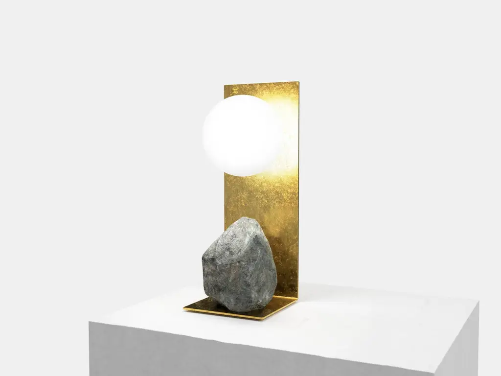 Hand brushed brass and stone table lamp by Batten and KampShelter to Ground collectionSignedLimited edition of 25 + 2 APDimensions: W 14 x D 14 x H 33 cmMaterials: Hand brushed brass, natural stone, tinted glass.LED, electrical componentsEach uniqueThe stone is different with each piece and cannot be selected by the client.Shelter to Ground collectionBatten and Kamp’s recent series ‘Shelter to Ground’, sees the couple produce uniquefunctional objects by carefully combining natural stones and branches with industrialmaterials in a process that they refer to by the mantra “as little interference aspossible”. The one of a kind chairs, tables, lights, and flower stands in the series areelementally simple, yet the process by which they are created is both intellectually and physically laborious.The creation of each piece begins with couple first finding stones in nature andstudying them in their studio. Accompanying metal and glass components are thendesigned in response to the natural shapes of the stone and produced in collaboration with local sifu. This process creates furniture objects where organic and ‘designed’ components find harmony - each piece is unique, as defined by nature and not the will of the designer.“These are pieces of furniture - to be used - but their primary function is as tools for contemplation. Like scholar’s rocks, or work by Lee Ufan, they are intended to help people think or feel more deeply about relationships - to nature, between different materials, places, landscapes, ideas.”Batten and Kamp is a creative partnership between interior architect Alexandra Batten and designer or artist Daniel Kamp. The duo creates one of a kind furniture, objects, installations, and interiors with clients and collaborators in Hong Kong, New Zealand and the wider Asia Pacific. Their projects have received accolades around the world, most recently their ‘Shelter to Ground’ collection was published in esteemed cultural publications such as Design Boom and Design Anthology.“Our work is a pursuit of raw beauty, of poetry in three dimensions. Art and design, creation and curation, product, sculpture, interiors, architecture - all of it - or none of it. Just beauty.”