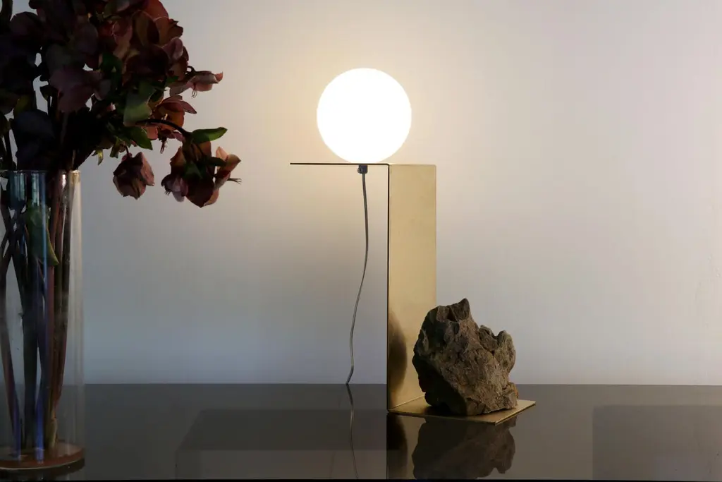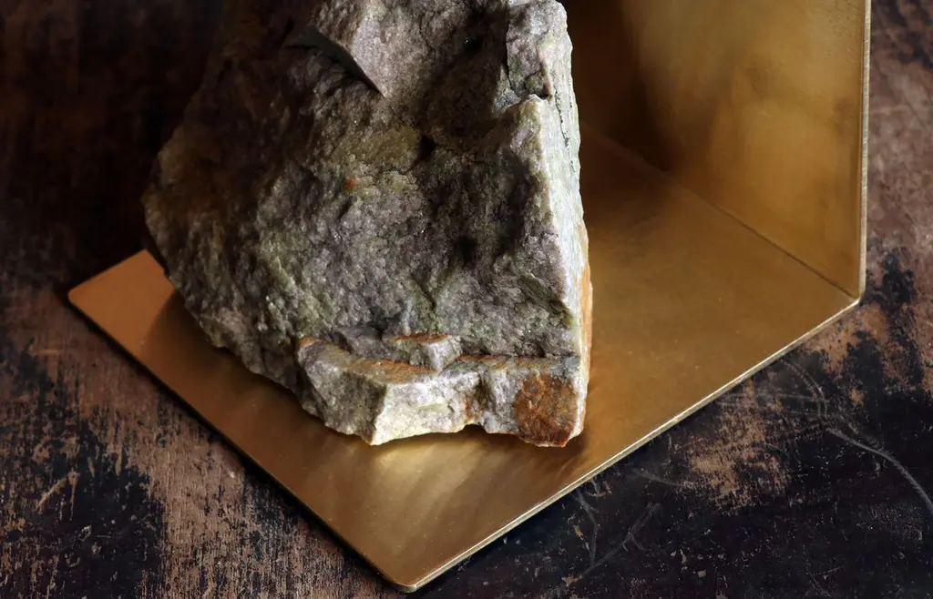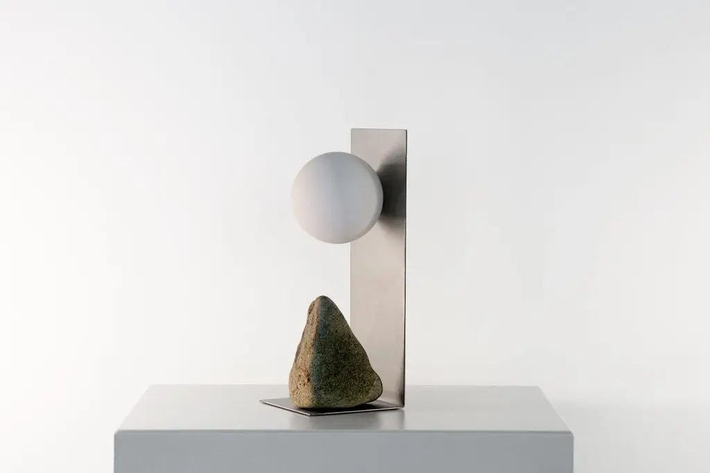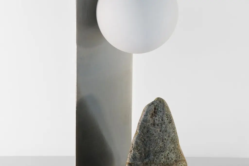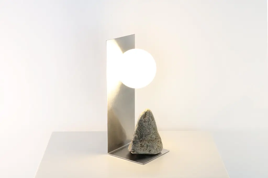 Hand brushed brass and stone table lamp by Batten and KampShelter to Ground collectionSignedLimited edition of 25 + 2 APDimensions: W 14 x D 14 x H 33 cmMaterials: Hand brushed brass, natural stone, tinted glass.LED, electrical componentsEach uniqueThe stone is different with each piece and cannot be selected by the client.Shelter to Ground collectionBatten and Kamp’s recent series ‘Shelter to Ground’, sees the couple produce uniquefunctional objects by carefully combining natural stones and branches with industrialmaterials in a process that they refer to by the mantra “as little interference aspossible”. The one of a kind chairs, tables, lights, and flower stands in the series areelementally simple, yet the process by which they are created is both intellectually and physically laborious.The creation of each piece begins with couple first finding stones in nature andstudying them in their studio. Accompanying metal and glass components are thendesigned in response to the natural shapes of the stone and produced in collaboration with local sifu. This process creates furniture objects where organic and ‘designed’ components find harmony - each piece is unique, as defined by nature and not the will of the designer.“These are pieces of furniture - to be used - but their primary function is as tools for contemplation. Like scholar’s rocks, or work by Lee Ufan, they are intended to help people think or feel more deeply about relationships - to nature, between different materials, places, landscapes, ideas.”Batten and Kamp is a creative partnership between interior architect Alexandra Batten and designer or artist Daniel Kamp. The duo creates one of a kind furniture, objects, installations, and interiors with clients and collaborators in Hong Kong, New Zealand and the wider Asia Pacific. Their projects have received accolades around the world, most recently their ‘Shelter to Ground’ collection was published in esteemed cultural publications such as Design Boom and Design Anthology.“Our work is a pursuit of raw beauty, of poetry in three dimensions. Art and design, creation and curation, product, sculpture, interiors, architecture - all of it - or none of it. Just beauty.”
