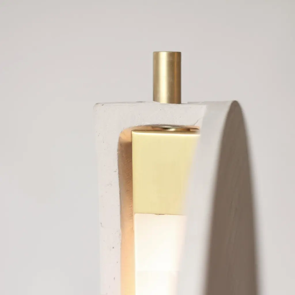 Minimalist-styled sand ceramic table lamp reveals the textures and colors gradian of its materials, handmade movements, and unexpected organic form.Slowly air-dried for more than 30 days, until it reaches a few hours into a low temperature hoven, to reach its final color and form. During all this process, the clay disc will take an unexpected organics movement in its form, almost like a living material, making each object unique in its details and colors. The brass part would be added at the end and tailored for each piece.The sculpture results in a process of hand modeling and details carving of grey clay, the base is a result of the casting process, with the gradian colors and texture of its brut form.- 1 x bulb LED R7s 9W (100W) 1.055 lm Bi-volt (100-240v) - easy to find and easy to install; IMPORTANT: the sconce is sold with the bulb already installed.