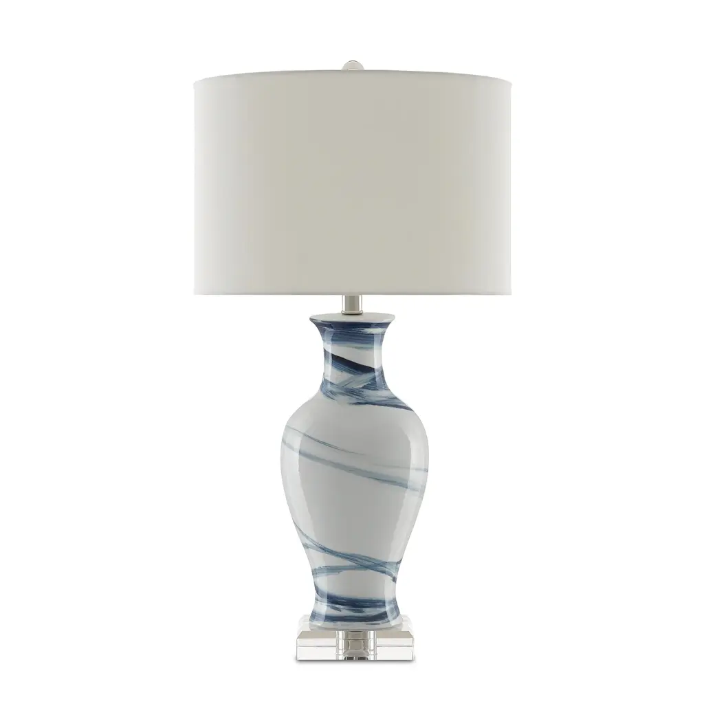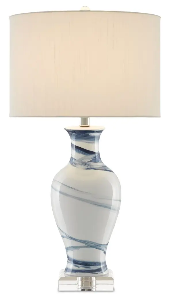 The beauty of finely wrought porcelain shows through in our Hanni Table Lamp. The surface of the white lamp has been decorated with brushstrokes in an elegant shade of navy blue. The optic crystal base and the nickel finish on the hardware add to the luminosity of this lamp that it is topped with an off-white shantung drum shade. Ships In 7-10 Business Days This image is for illustrative purposes only. The colors shown are accurate within the constraints of lighting, photography, and the color accuracy of your screen.