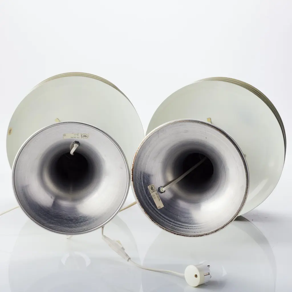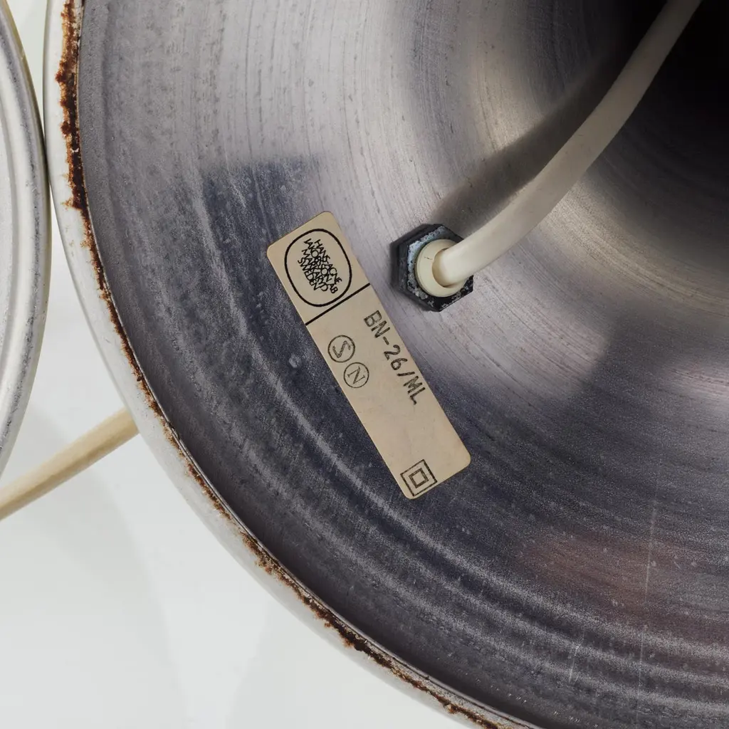 Hans-Agne Jakobsson — Table Lamp, Model BN 26, Markaryd, Sweden, 1960s–70sOne of a pair availableDesigner: Hans-Agne Jakobsson (1919–2009)Manufacturer: AB Hans-Agne Jakobsson, Markaryd, SwedenModel: BN 26Design Period: 1960s–1970sLabeled: Manufacturer's label intactA quintessential example of mid-century Swedish lighting design, this BN 26 table lamp by Hans-Agne Jakobsson captures the designer’s hallmark approach to atmosphere, material, and softly diffused light. Produced by Jakobsson’s own firm in Markaryd, Sweden, the lamp features his iconic lamella-style shade, composed of stacked aluminum slats that scatter and soften light into a warm, ambient glow.Minimal yet striking, the BN 26 reflects Jakobsson’s architectural sensibility—focusing on indirect illumination and sculptural simplicity. The lamp’s rhythmic structure and metallic finish make it ideal for both vintage Scandinavian interiors and modern minimalist spaces.This listing is for one lamp, with a matching pair available.Dimensions:Height: 45 cm (17.7 in)Diameter (approx.): 28–30 cm (11–11.8 in)Condition Report:Visible wear consistent with age and useOccasional surface scratches and minor dentsA few lamellae are slightly bent or misalignedPresents well overall and retains original characterNotes:European plug (rewiring or adapter may be needed for other regions)Ships professionally packed and cratedPrice is for one lamp; please inquire if interested in the pair