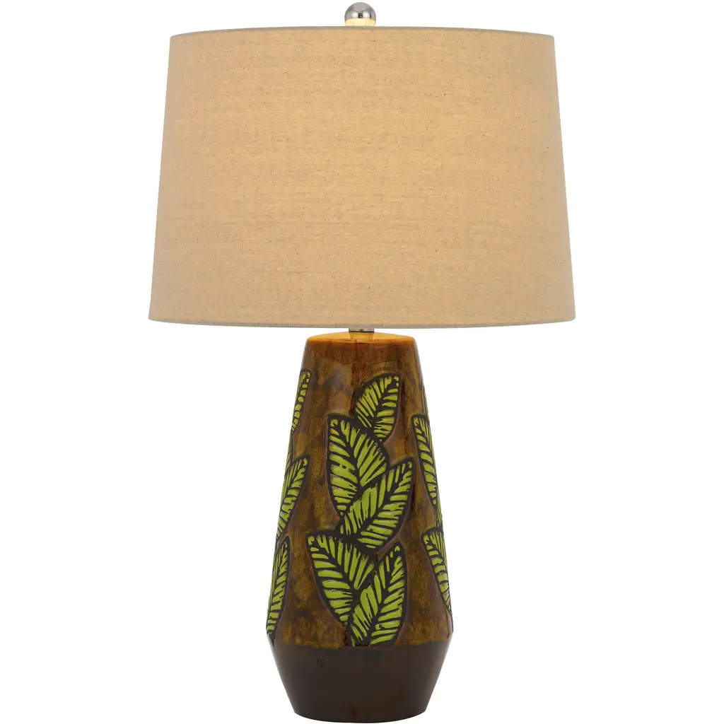 Add a tropical vibe to your space with this brown ceramic leaf print table lamp. It features a marble ceramic finish with green leaf painted accents and a beveled bottom design. The look is completed with a light brown fabric shade and matching finial.