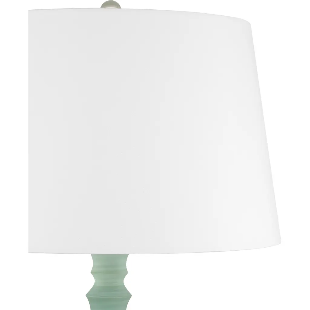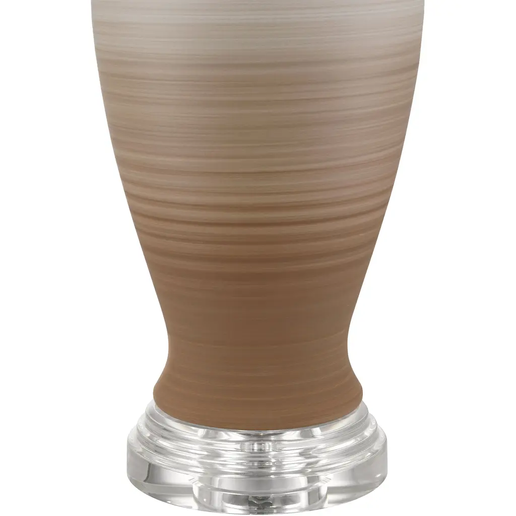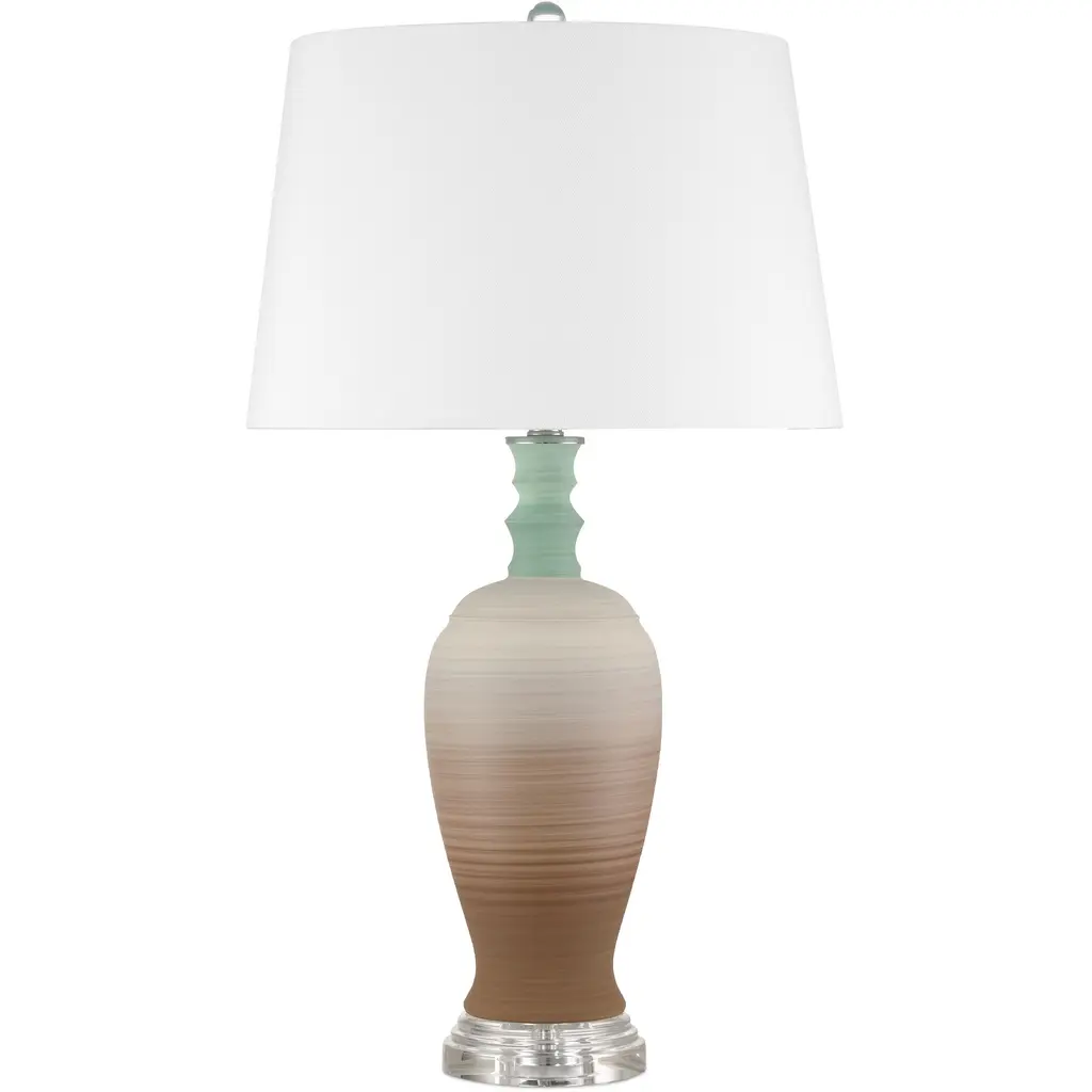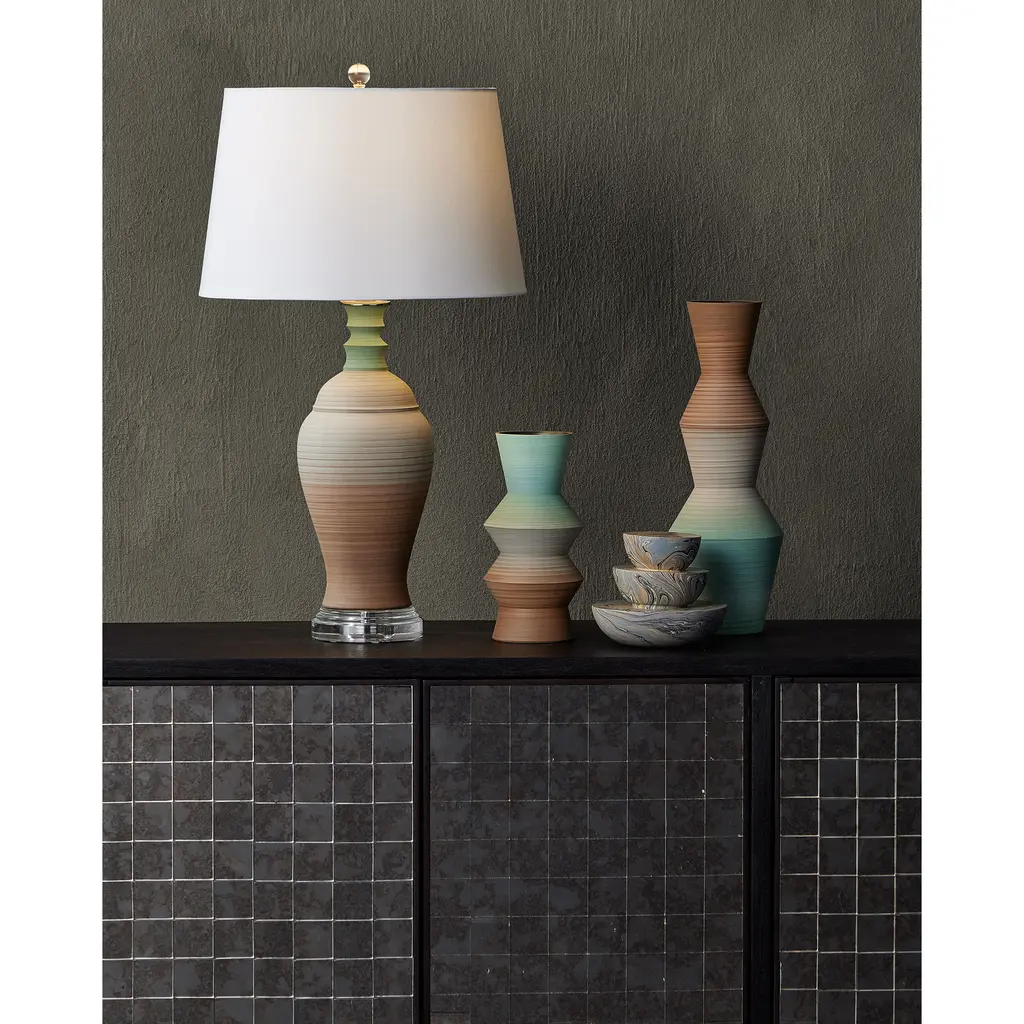 A playful retro vibe enters a room when the Happy 80's Green and Brown Vase Set come on the scene. The lamps body is painted with unique striations of earthy brown and pale blue that are achieved while still spinning on the potter's wheel. The result is a layered pattern that adds depth and character to the design. The shade that is fastened with an optic crystal finial is white on the outside and lined in a blue fabric.