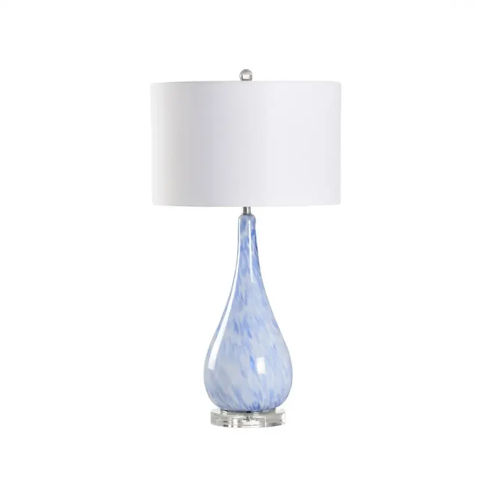 Add a touch of color to any room in your house with this hand blown art glass table lamp. It features an eye catchinig turquoise blue watercolor effect on clear bowling pin shape body. This beautiful lamp comples complete with a crisp white linen shade and matching finial.Bulb Wattage: 150W - 3 wayNumber of Bulbs: 1Type of Bulb: incandescentBulbs Included: no
