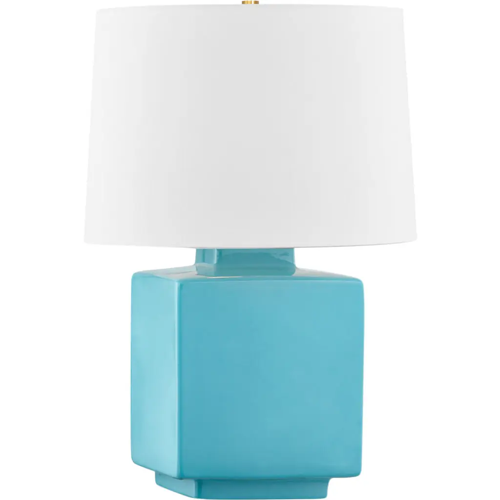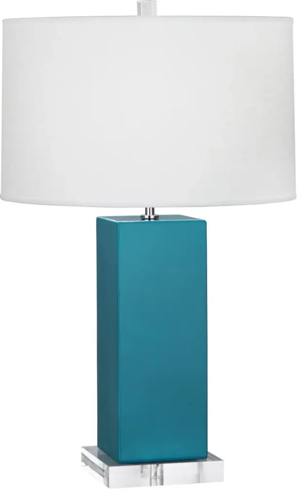 Peacock Harvey Contemporary Accent LampFeaturesNumber of bulb: 1Bulb type: G16.5Max wattage: 60WVoltage: 120VSocket: Candelabra Phenolic E12Switch: Hi-Lo RotarySwitch location: Line SwitchFinish: Peacock Glazed CeramicShade: Oyster Linen Shade with Self Fabric Top DiffuserCord color: SilverUL listed: DryDimensionsShade dimensions: 11 inches top x 11.5 inches bottom x 7.5 inches down sideBase dimensions: 1 inch height x 5.25 inches width x 5.25 inches depth