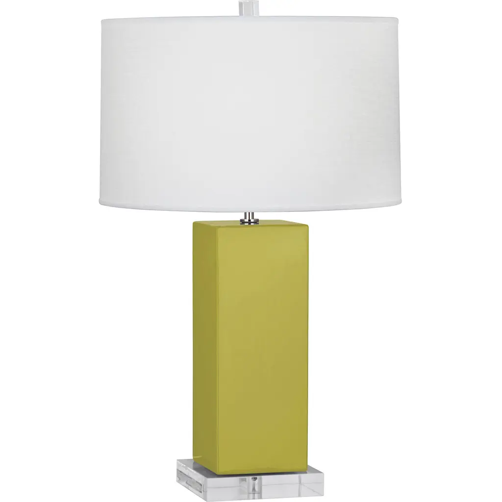 Sunset Harvey Contemporary Table LampFeaturesNumber of bulb: 1Bulb type: AMax wattage: 150WVoltage: 120VSocket: Medium Plated Sheet E26Switch: Hi-LoSwitch location: SocketFinish: Sunset Yellow Glazed CeramicShade: Oyster Linen ShadeCord color: SilverUL listed: DryDimensionsShade dimensions: 19.5 inches top x 20 inches bottom x 12 inches down sideBase dimensions: 1.5 inches height x 8 inches width x 8 inches depth