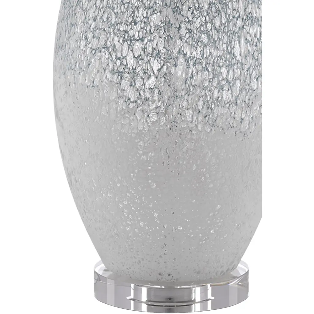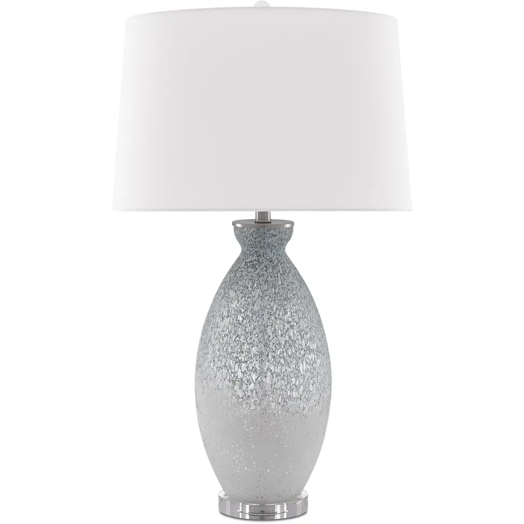 Like the moon rising out of fog, the body of our Hatira Table Lamp sets an ethereal scene. The mysterious patterning on the clear glass was hand-applied in pale blue and white to give it that other-worldly feel. We placed it on an optical crystal base to keep the overall composition light and airy. The oversized off-white linen drum shade directs the illumination downward to wash this beautiful lamp in an exquisite glow.