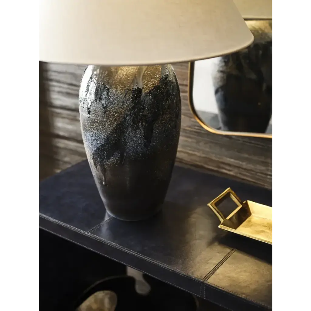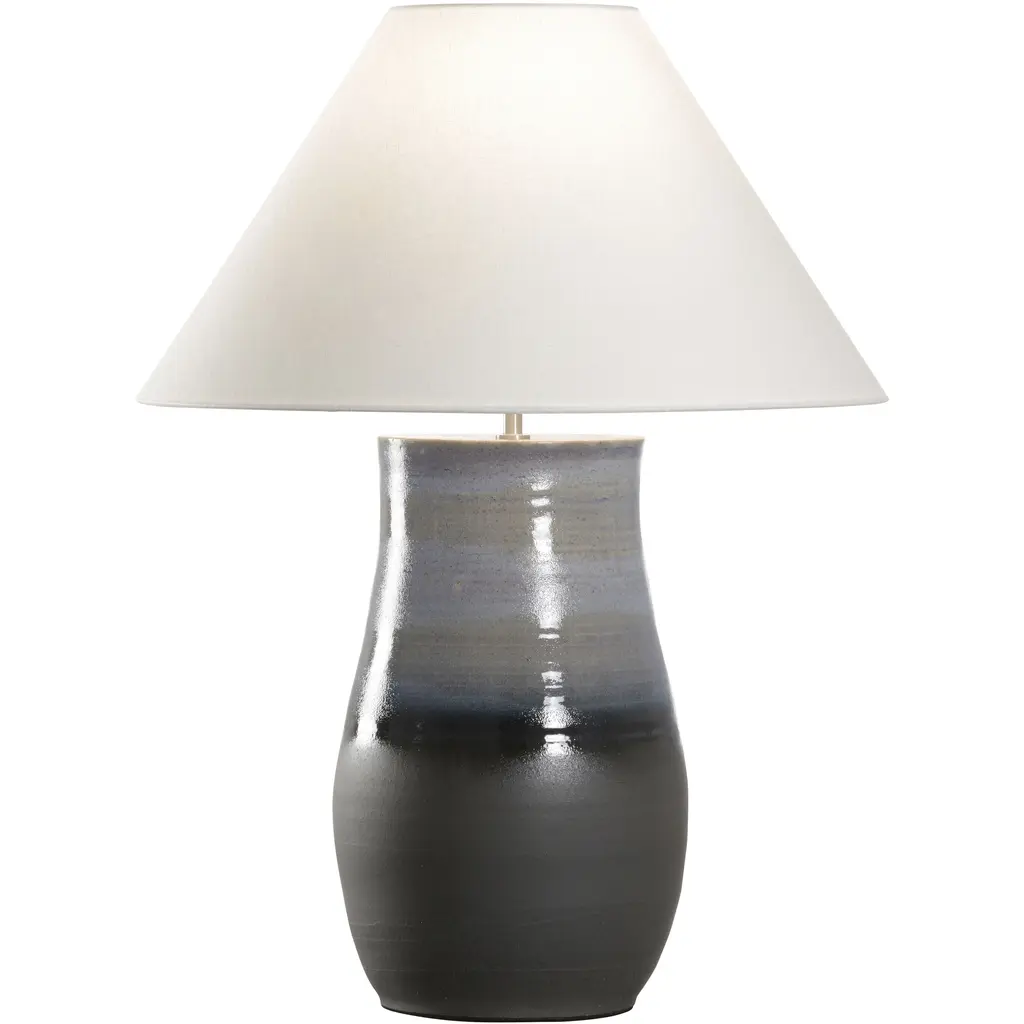 The Hatsu Table Lamp, part of the Shiga collection, is a stunning blend of traditional Japanese craftsmanship and modern design. Handcrafted with a unique combination of textured clay and a smooth, glossy glaze, this lamp embodies the balance between raw, natural elements and refined artistry. The deep indigo tones create a rich contrast against the rugged texture of the ceramic body, adding depth and dimension to the piece.