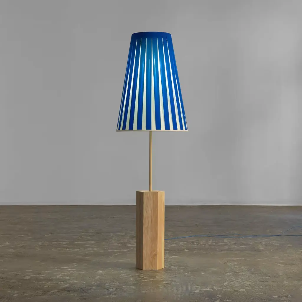 The Haute Couture lamp celebrates the spirit of Parisian Haute Couture with a design that features a hexagonal ash base anchoring a colorful gown made of lightweight pongé fabric strips, allowing light to filter through. Its lampshade consists of two-tone overlapping pongé ribbons, supported by an ash wood base and stem. The lamp features 3x E27 or E26 bulbs (not included) and a black silk-like braided cable. It has a switch on the cable and it is not dimmable. This item is sold with an adapter.