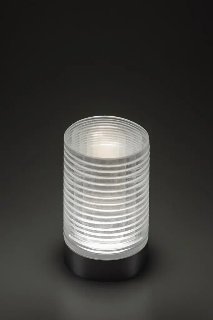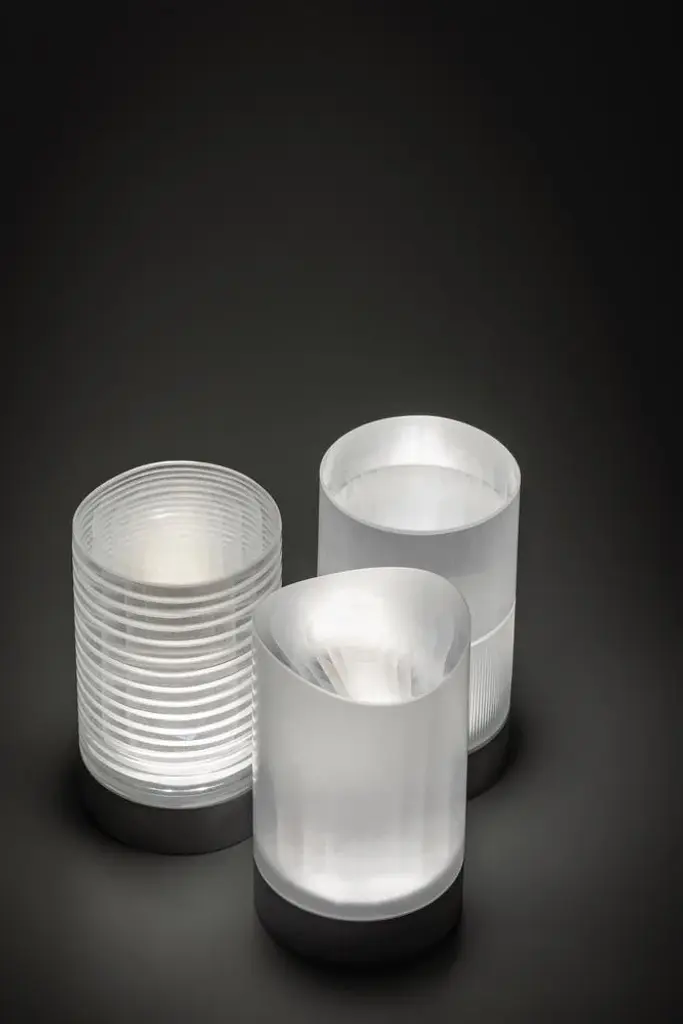 Designed by Federico Peri for Purho Murano, Haute is a rechargeable table lamp of restrained dimensions (diameter 76 x height 133mm) made entirely of Murano glass. Part of the Incisioni collection consisting of vases, candelabra, candle holders and ash trays linked by a careful search for the potential of glass engraving applied to the world of design, Haute is distinguished by a thin base in brushed aluminium and the linearity of the cylindrical body covered with banding, pleating and ribbed cuts. Three models are available: Haute Silk characterized by banding running up to the slightly concave upper surface, Haute Doll It composed of one smooth section with the other half covered by a dense knurling, Haute Stripe covered with thick horizontal lines. Haute — together with its smaller twin Petite — is a collection of gracious lamps and unique design made even more special by the three chosen colours: crystal, smoke, rosé. Labeled by Maker