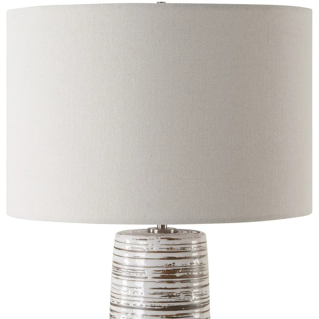 The Haven Table Lamp Combines Elegance With A Touch Of Rustic Charm. This Piece Features A Sleek Ceramic Base Cloaked In A Smooth White Glaze, Adorned With Subtly Ribbed, Distressed Accents, All Complemented By Brushed Plated Nickel Hardware For A Refined Finish. The Round Hardback Drum Shade Is Made In A Casual White Linen Fabric.