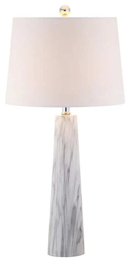 The stately design of this modern table lamp feels statuesque on tabletops throughout the home. A white marble lamp base adds the perfect element of antiquity without feeling old fashioned, thanks to a satin nickel-plated accents and off-white linen drum lampshade. Soft gray veining throughout the base makes this natural stone lamp is a graceful addition to grand interior spaces.
