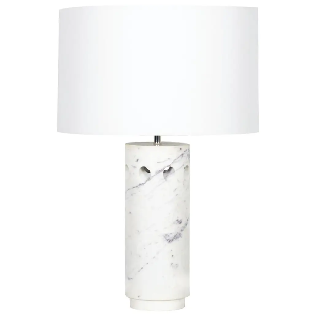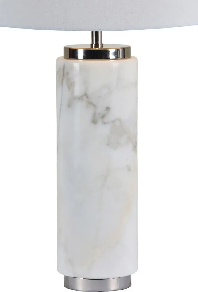 The stately design of this modern table lamp feels statuesque on tabletops throughout the home. A white marble lamp base adds the perfect element of antiquity without feeling old fashioned, thanks to a satin nickel-plated accents and off-white linen drum lampshade. Soft gray veining throughout the base makes this natural stone lamp is a graceful addition to grand interior spaces.Number of Bulbs: 1Bulb Type: E26Wattage: 100Bulbs Included: No