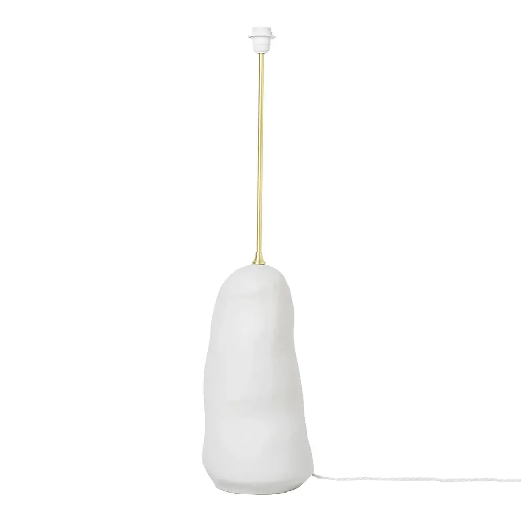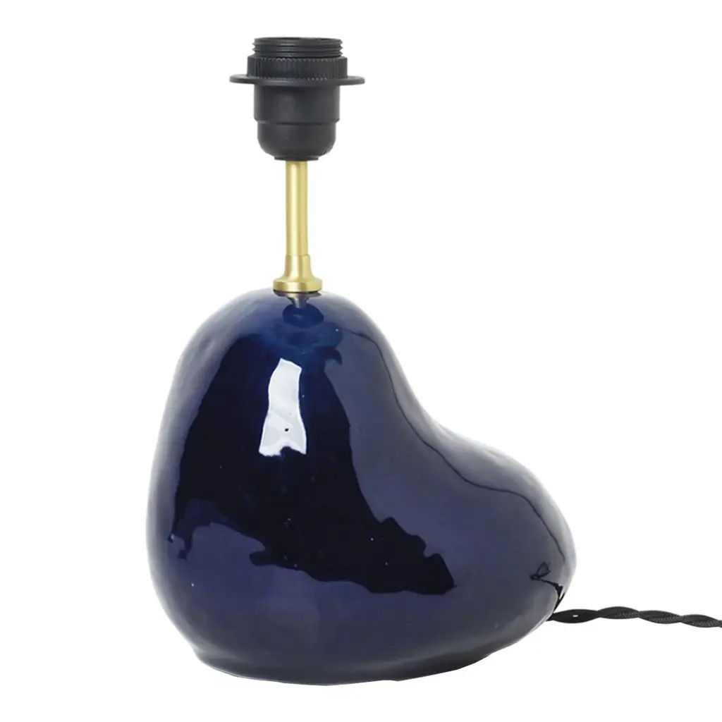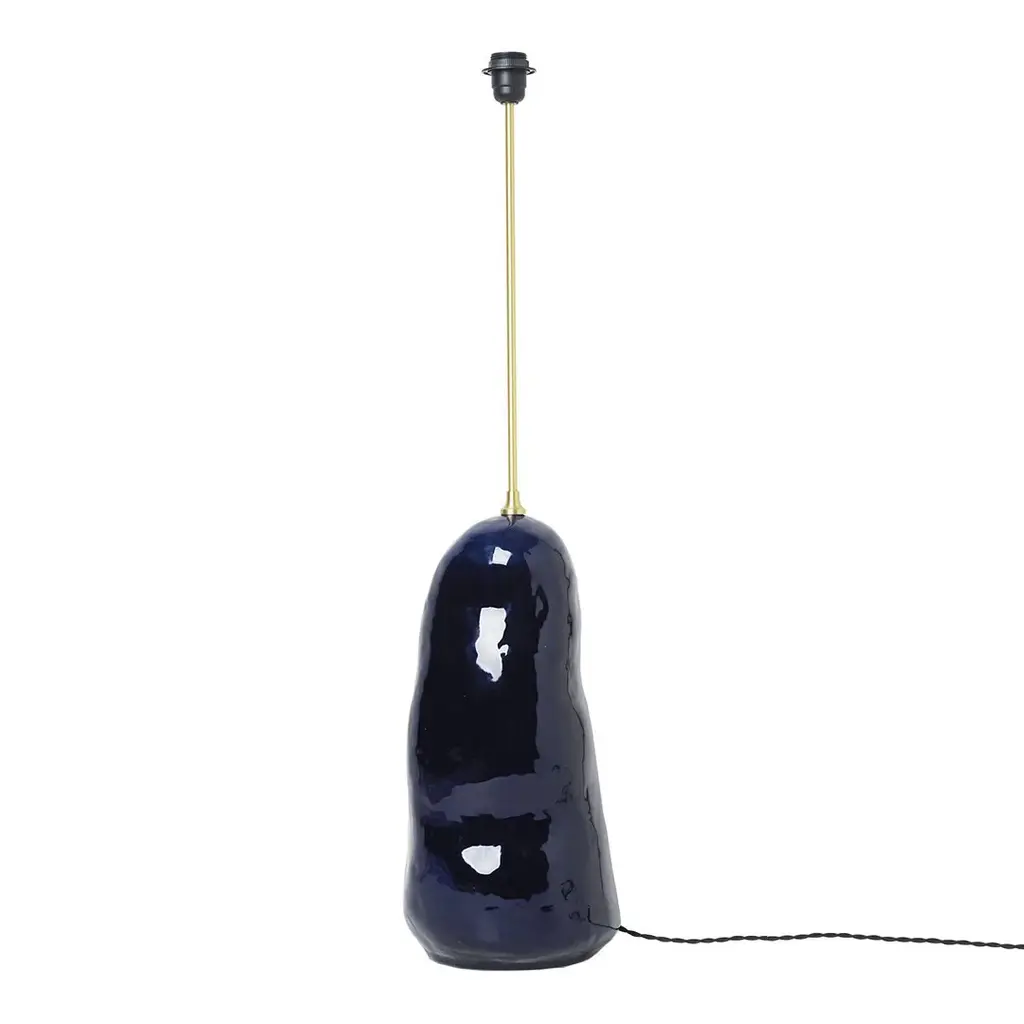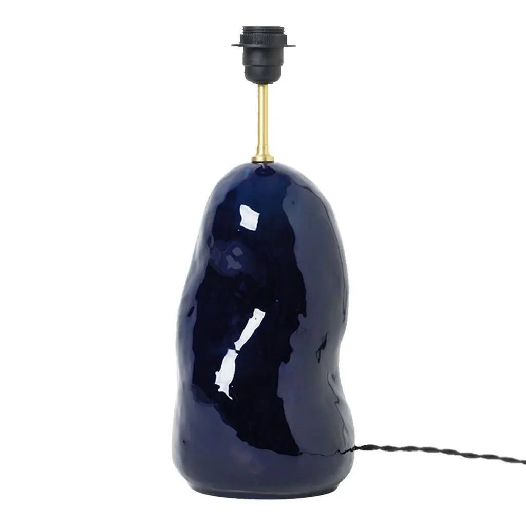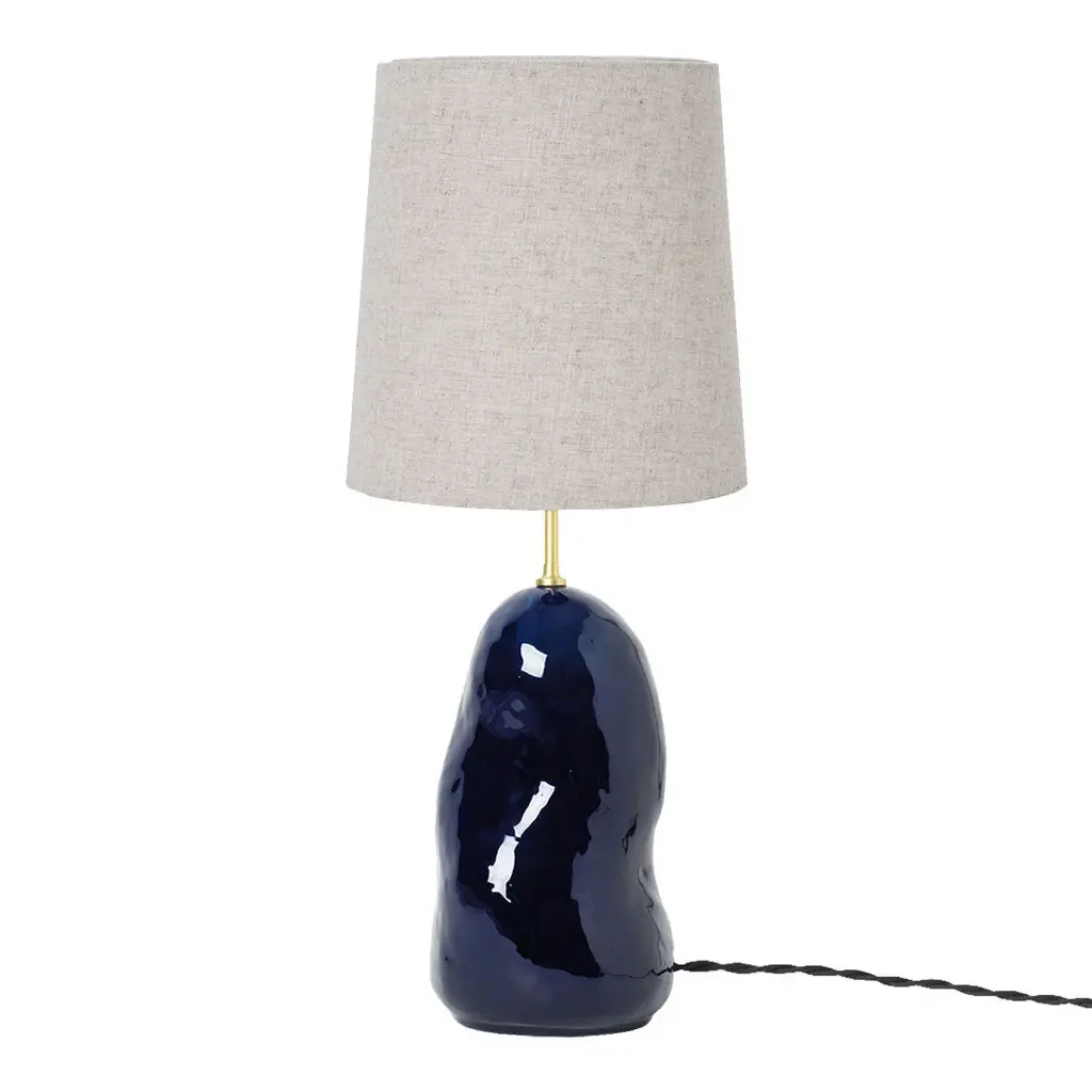 The Hebe lamp series updates the classic lamp with bold shapes and an artistic touch. Initially sculpted by hand, the fluid silhouette of the base is inspired by nature and has a feminine note. Made of ceramic, the base comes in several different textures and sizes. The high-gloss glazing in a deep blue nuance, gives the lamp a fantastic way of reflecting light on its curves. While the matte, coarse texture comes in a dark or light finish, offering any room a rough, yet calm look. Combine it with one of the matching textile lampshades of the series, available in a natural off-white or bolder curry.
