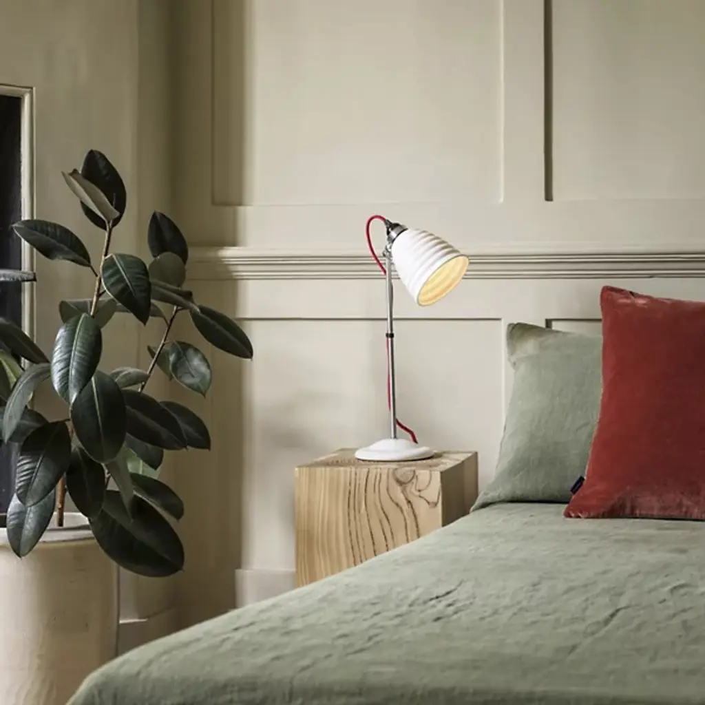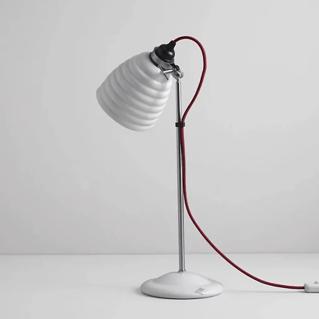 Designed by Sir Terence Conran in 2011, the Original BTC lighting Hector Bibendum Table Lamp celebrates two milestones: the 21st birthday of Original BTC and the 100th anniversary of the Michelin House in London. Made from the finest Bone China, the sophisticated design is shaped in the image of Bibendum (the Michelin Man), featuring a layered shade that is slip-cast and molded by hand. The manner in which the shade is fired produces a translucent quality once lit, and can be easily directed with the help of a smartly detailed aluminum structure.