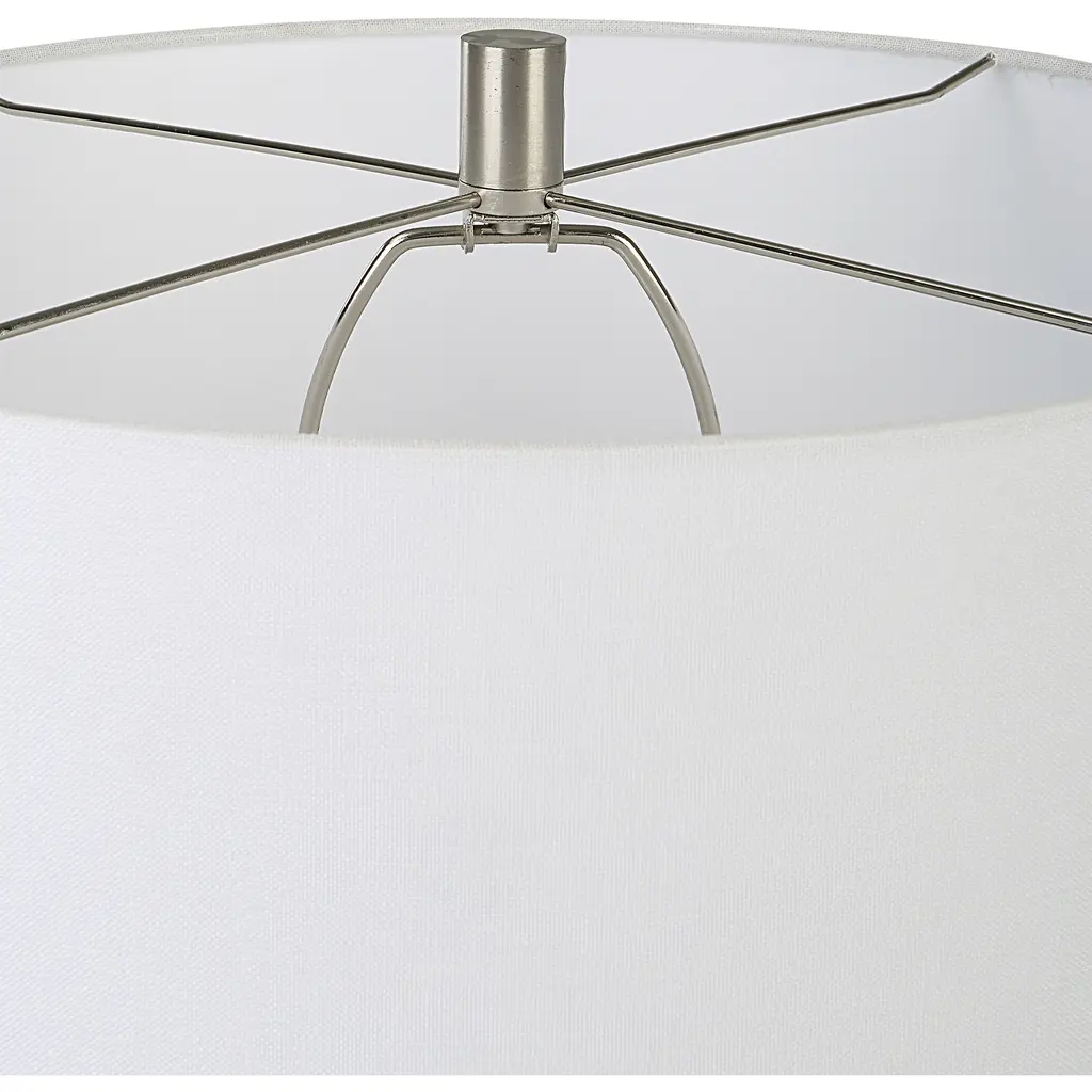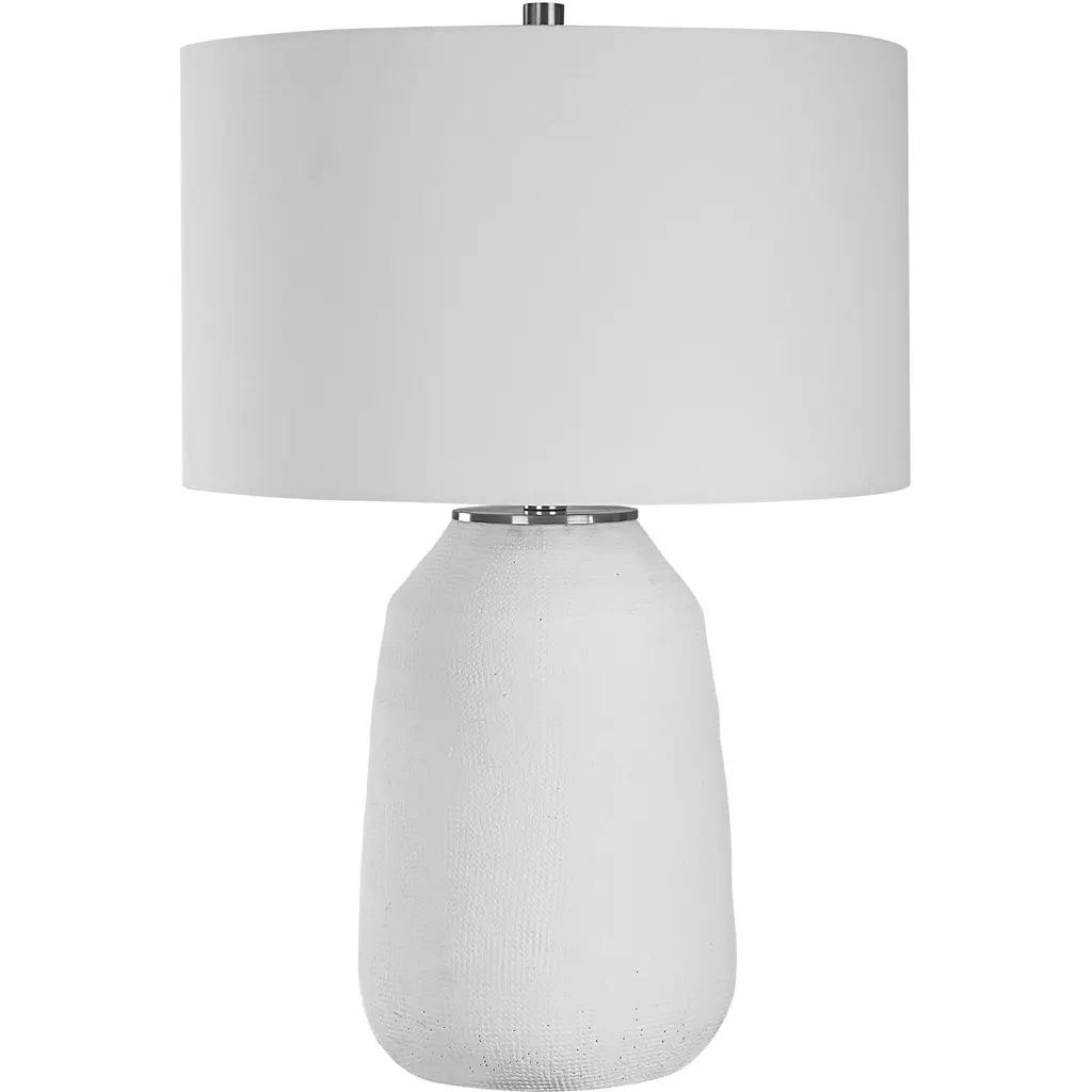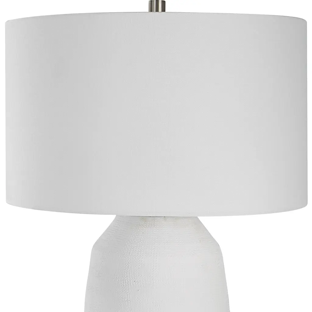 With Its Casual Ceramic Build And Chalk White Matte Finish, The Styling Possibilities For This Table Lamp Are Virtually Endless. All Steel Details Are Finished In Brushed Nickel. The Lamp Is Paired With A Hardback Drum Shade Covered In A White Fabric.