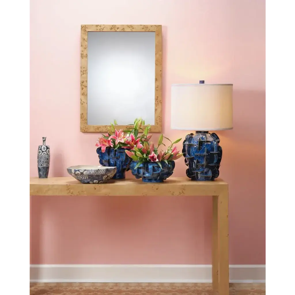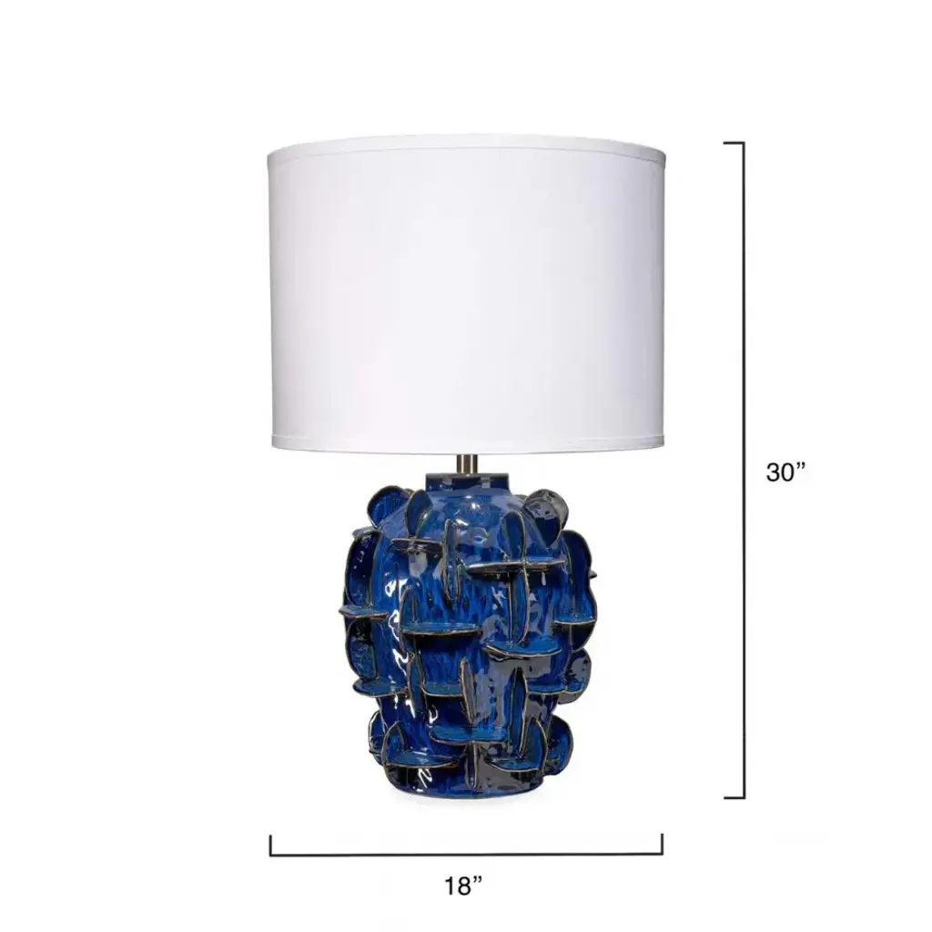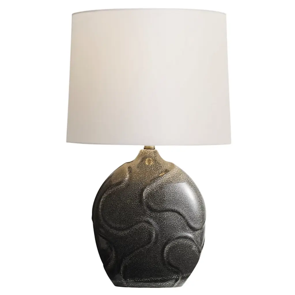 Beautifully handcrafted of ceramic, this showstopper of a table lamp is a riot of rich texture. To balance the free and bold shape of the base, we pair it with a simple linen drum shade and a coordinating finial, harp, and spider in resin. Add this striking lamp to any room of the home that needs a splash of style!