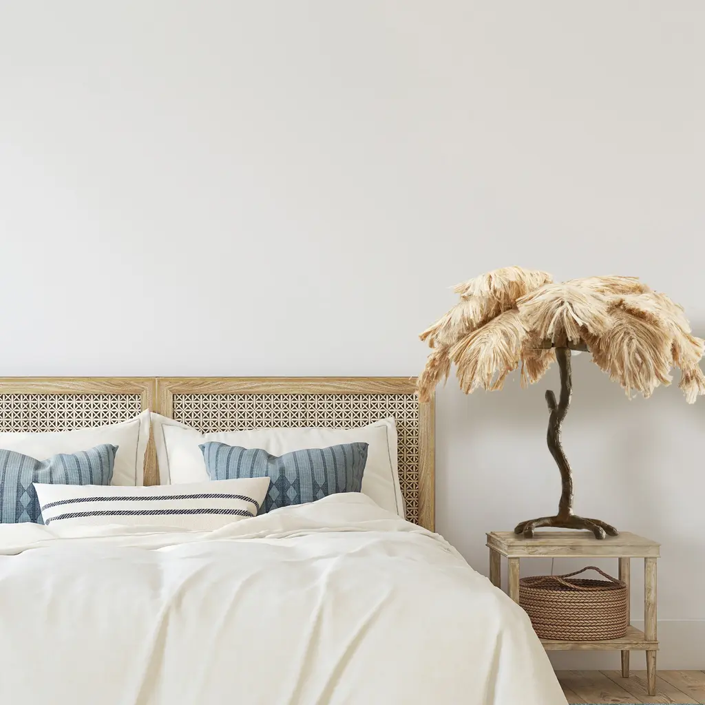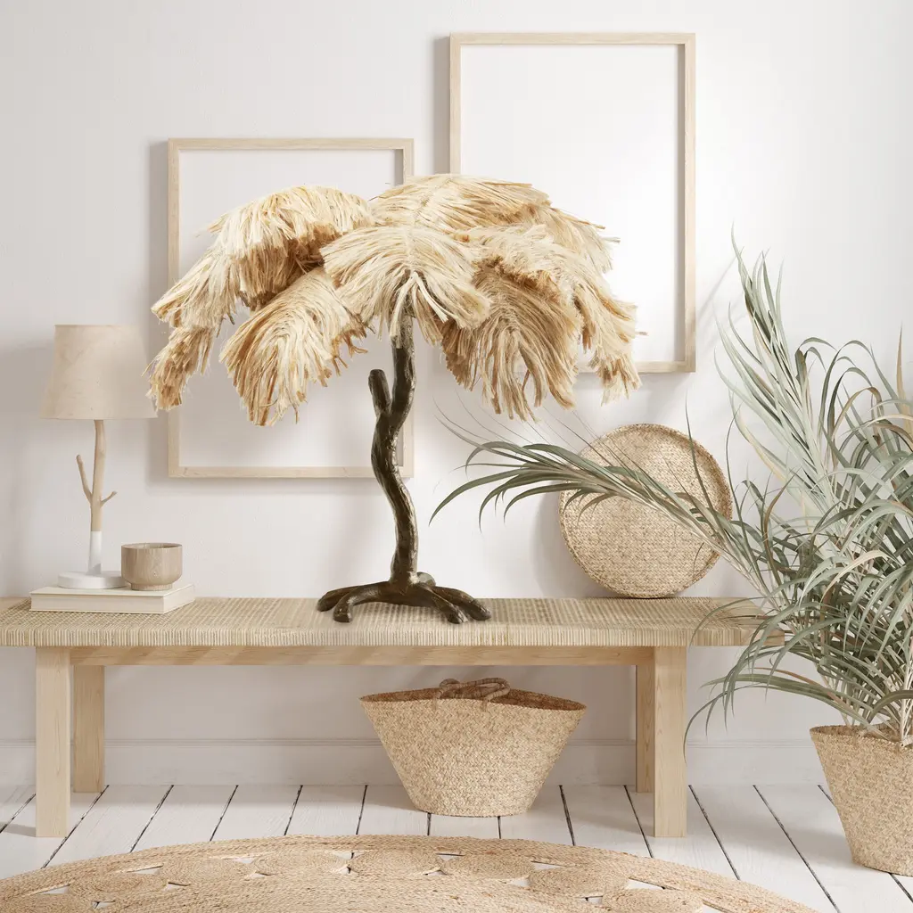 It's easy to bring some warm lighting and bohemian flair to your interior decor with this metal and jute table lamp. Made with an antique brass-tone metal base in a tree-shaped silhouette, this table lamp easily integrates into your existing decor. It features a palm tree-shaped shade made from light tan colored jute that lends interesting texture and glam style. Perfect for placing on an office desk, entryway console or a living room end table. Ambient lighting will shine nicely through the palm leaf shade and a 65-inch power cord provides convenient reach to a wall outlet.
